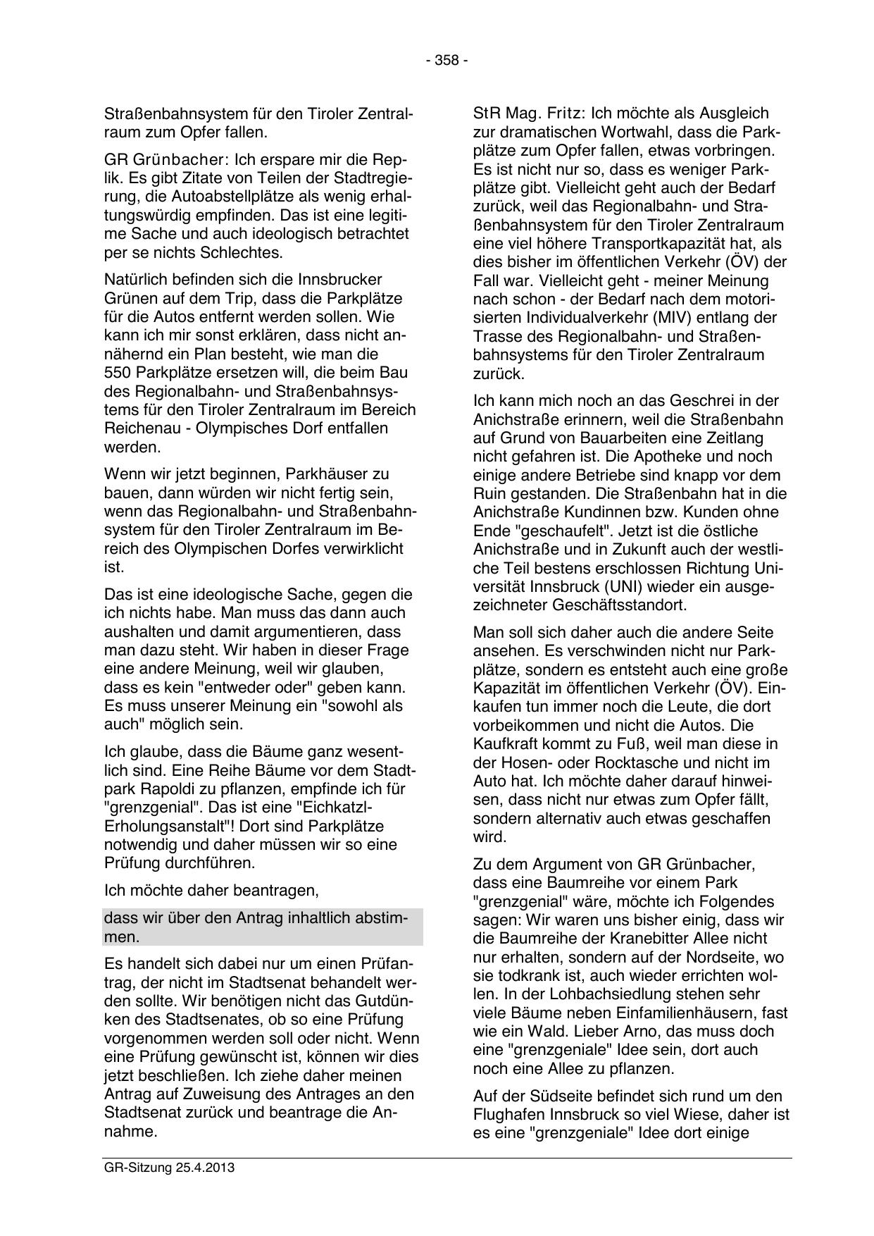 GR Grünbacher: Ich erspare mir die Replik. Es gibt Zitate von Teilen der Stadtregierung, die Autoabstellplätze als wenig erhaltungswürdig empfinden. Das ist eine legitime Sache und auch ideologisch betrachtet