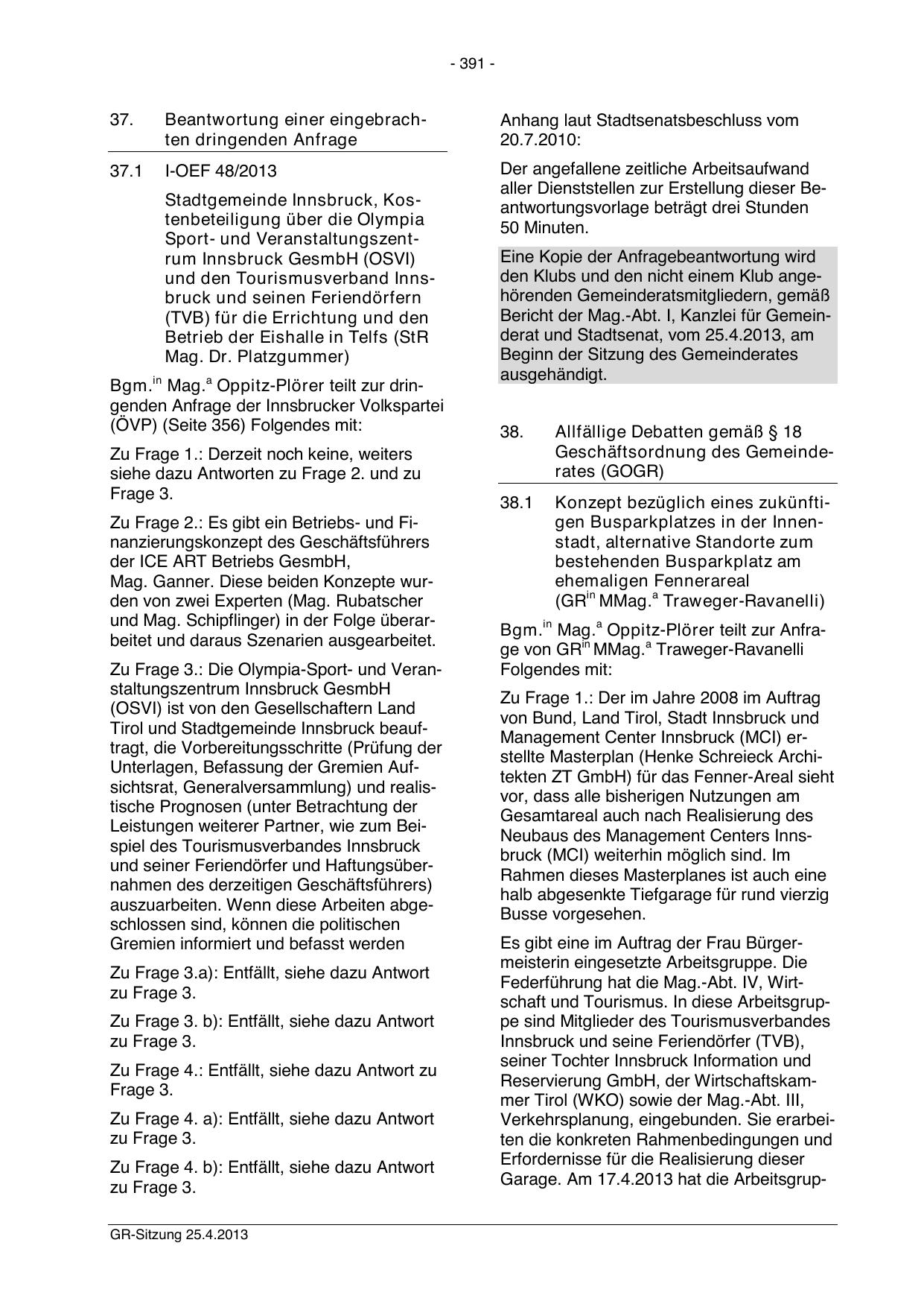Bericht der Mag.-Abt. I, Kanzlei für Gemeinderat und Stadtsenat, vom 25.4.2013, am
