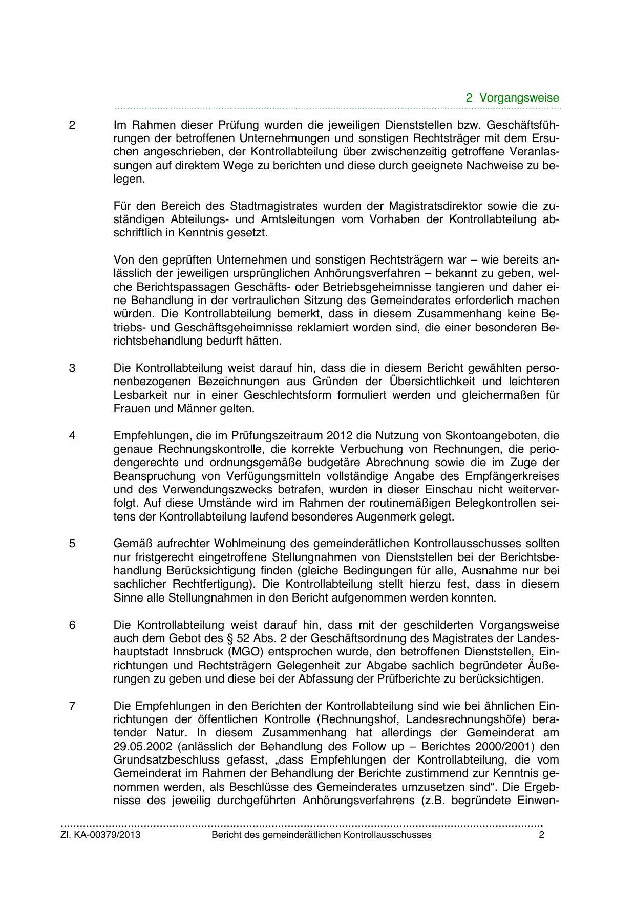 auch dem Gebot des § 52 Abs. 2 der Geschäftsordnung des Magistrates der Landeshauptstadt Innsbruck (MGO) entsprochen wurde, den betroffenen Dienststellen, Einrichtungen und Rechtsträgern Gelegenheit zur Abgabe sachlich begründeter Äußerungen zu geben und diese bei der Abfassung der Prüfberichte zu berücksichtigen.