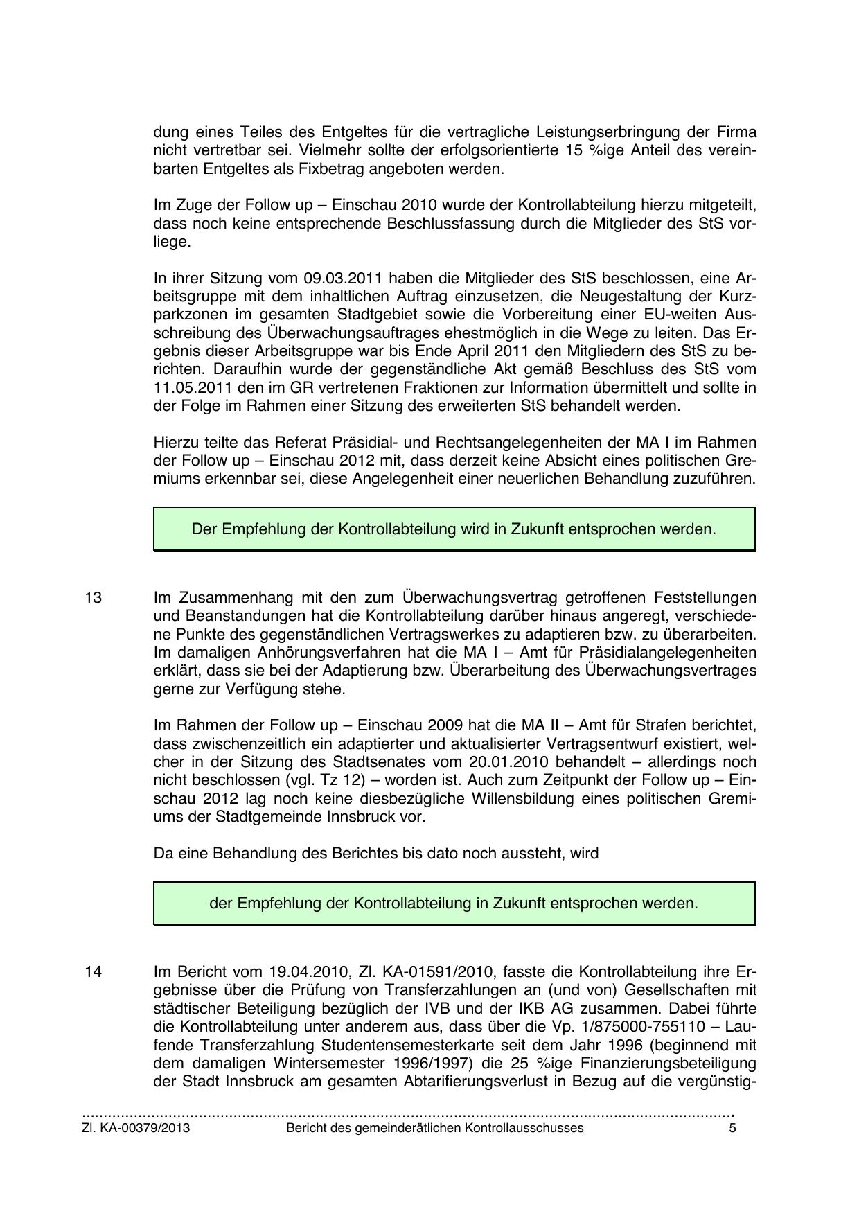 nicht beschlossen (vgl. Tz 12) – worden ist. Auch zum Zeitpunkt der Follow up – Einschau 2012 lag noch keine diesbezügliche Willensbildung eines politischen Gremiums der Stadtgemeinde Innsbruck vor.