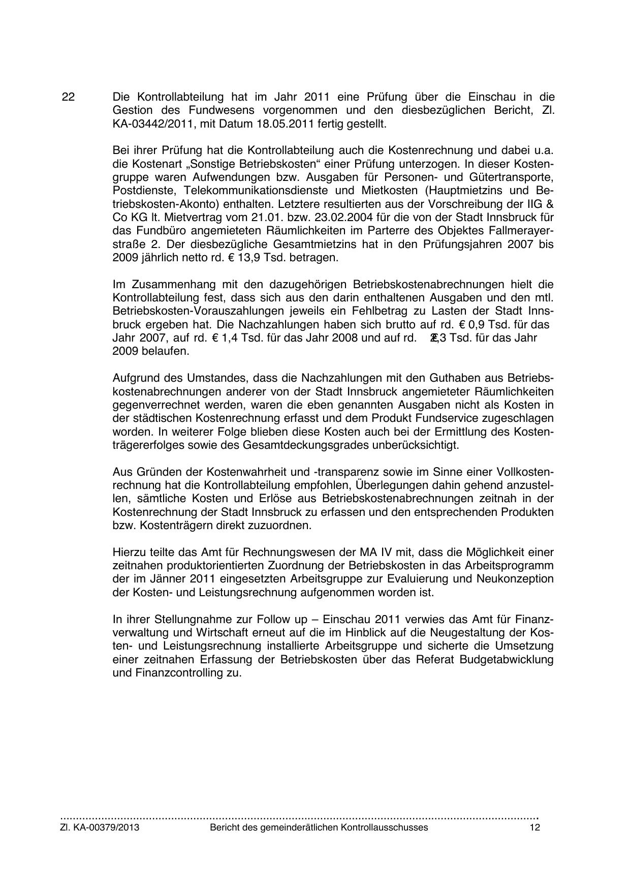 Betriebskosten-Vorauszahlungen jeweils ein Fehlbetrag zu Lasten der Stadt Innsbruck ergeben hat. Die Nachzahlungen haben sich brutto auf rd. € 0,9 Tsd. für das