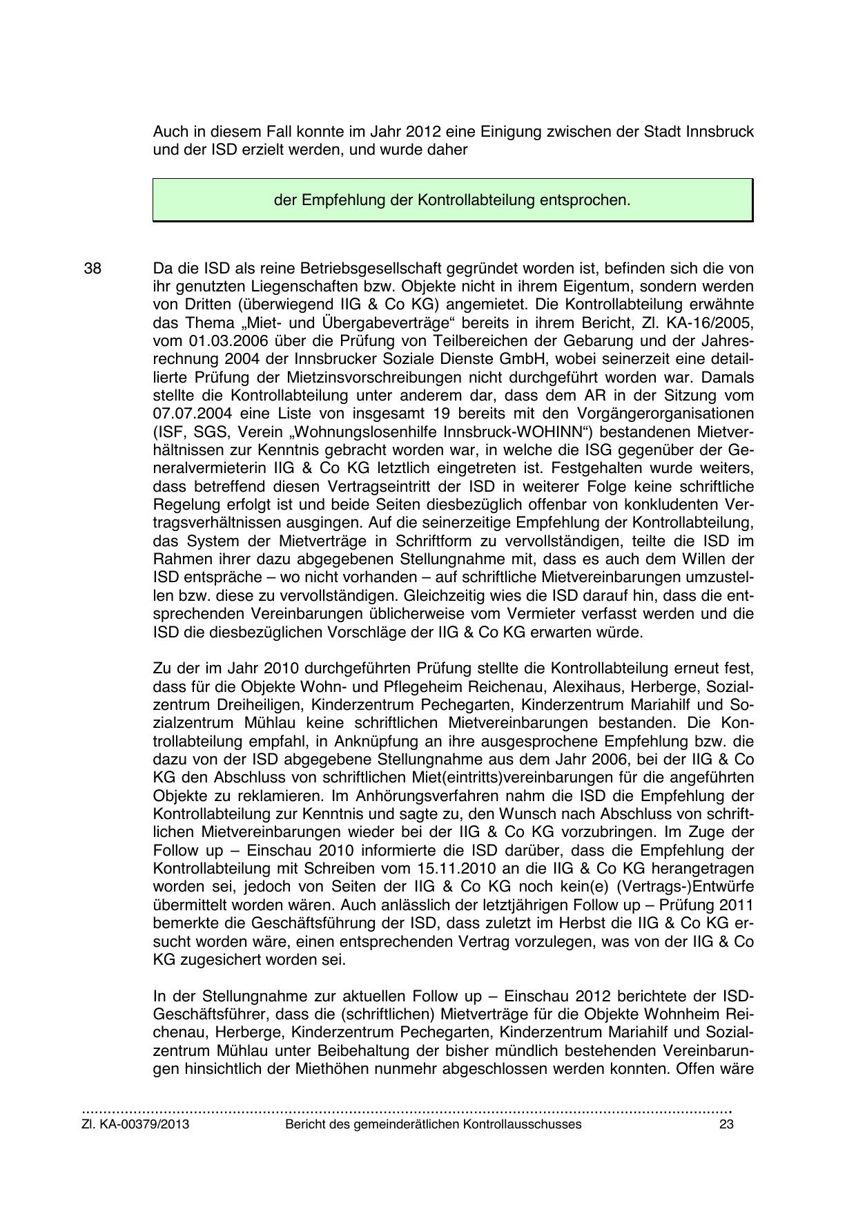 In der Stellungnahme zur aktuellen Follow up – Einschau 2012 berichtete der ISDGeschäftsführer, dass die (schriftlichen) Mietverträge für die Objekte Wohnheim Reichenau, Herberge, Kinderzentrum Pechegarten, Kinderzentrum Mariahilf und Sozialzentrum Mühlau unter Beibehaltung der bisher mündlich bestehenden Vereinbarungen hinsichtlich der Miethöhen nunmehr abgeschlossen werden konnten. Offen wäre