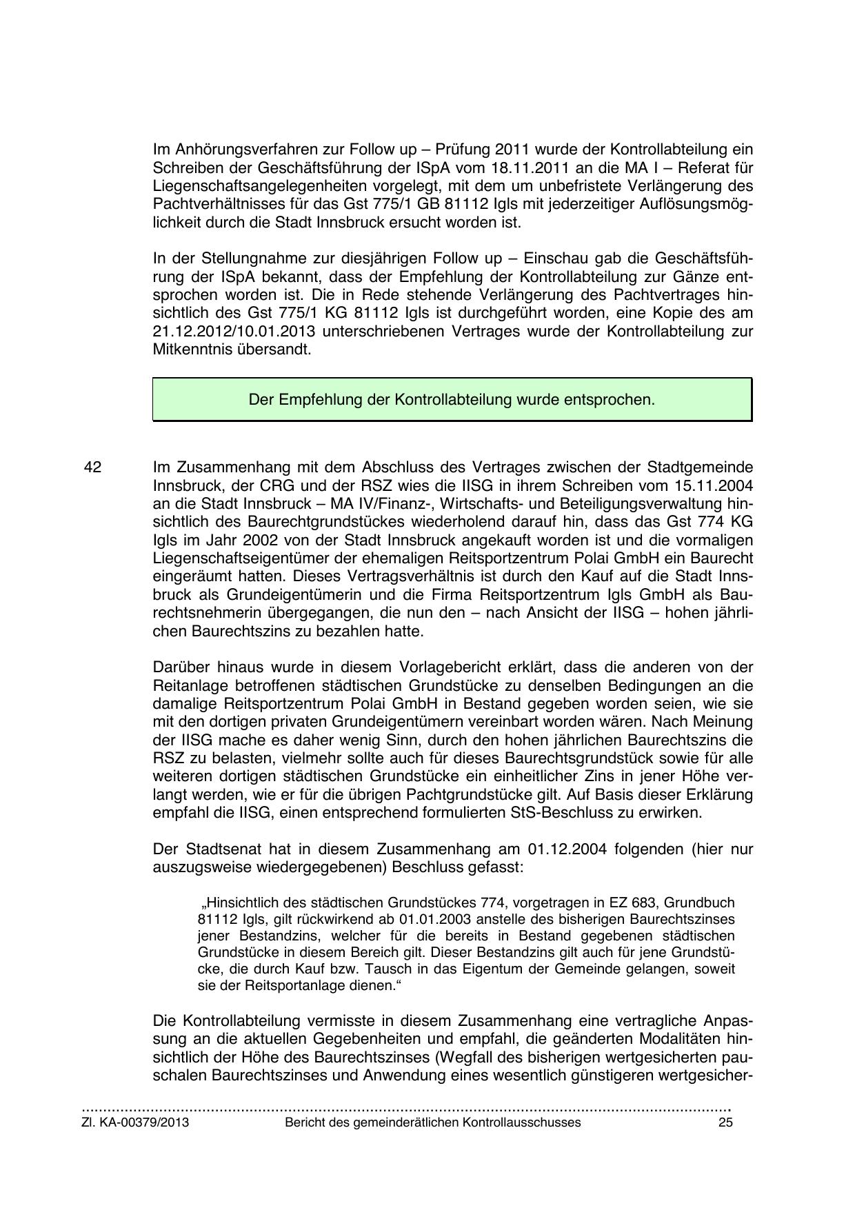 In der Stellungnahme zur diesjährigen Follow up – Einschau gab die Geschäftsführung der ISpA bekannt, dass der Empfehlung der Kontrollabteilung zur Gänze entsprochen worden ist. Die in Rede stehende Verlängerung des Pachtvertrages hinsichtlich des Gst 775/1 KG 81112 Igls ist durchgeführt worden, eine Kopie des am