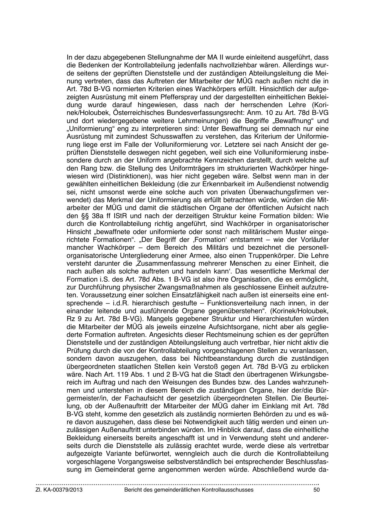 Art. 78d B-VG normierten Kriterien eines Wachkörpers erfüllt. Hinsichtlich der aufgezeigten Ausrüstung mit einem Pfefferspray und der dargestellten einheitlichen Bekleidung wurde darauf hingewiesen, dass nach der herrschenden Lehre (Korinek/Holoubek, Österreichisches Bundesverfassungsrecht: Anm. 10 zu Art. 78d B-VG