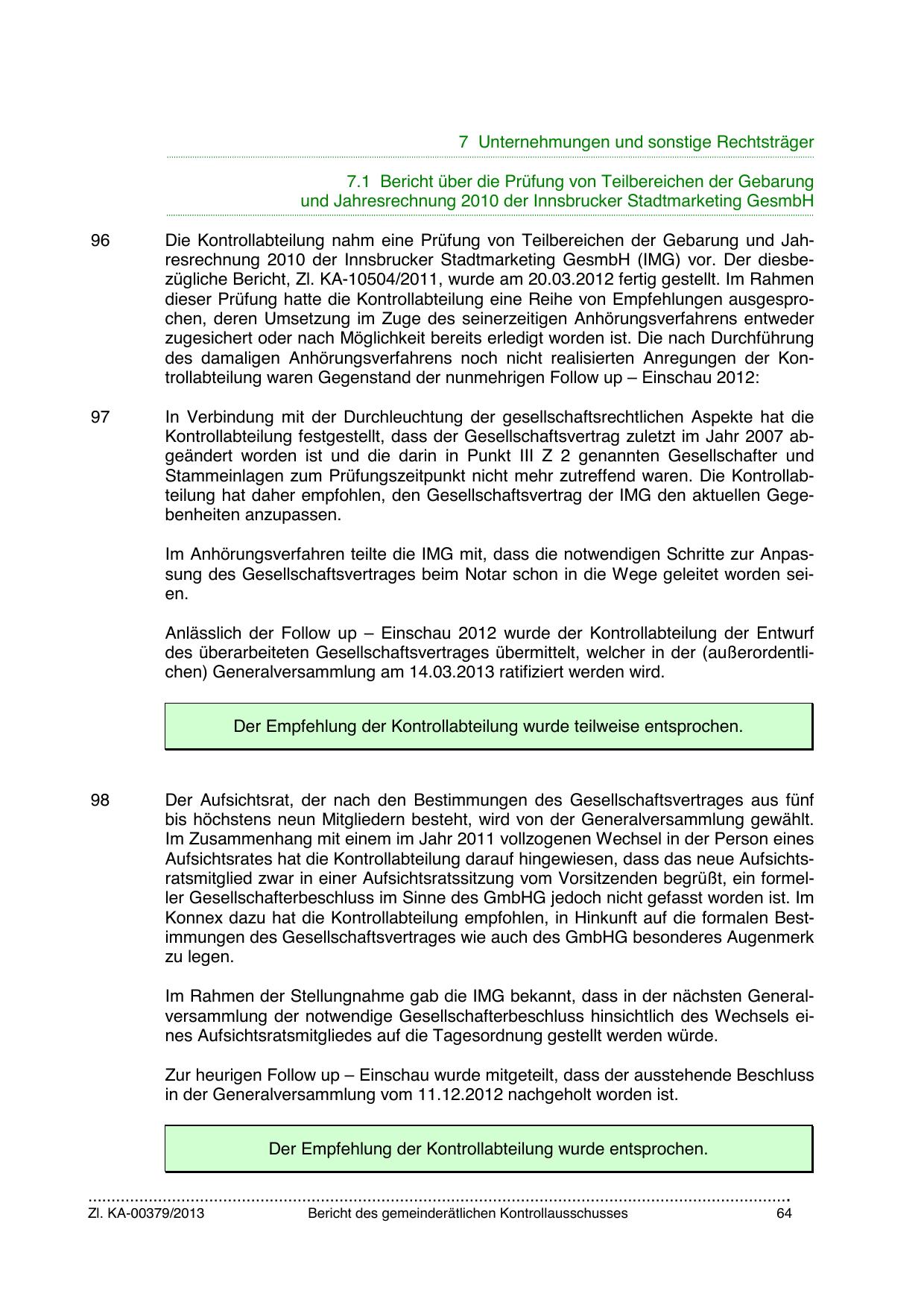 Die Kontrollabteilung nahm eine Prüfung von Teilbereichen der Gebarung und Jahresrechnung 2010 der Innsbrucker Stadtmarketing GesmbH (IMG) vor. Der diesbezügliche Bericht, Zl. KA-10504/2011, wurde am 20.03.2012 fertig gestellt. Im Rahmen