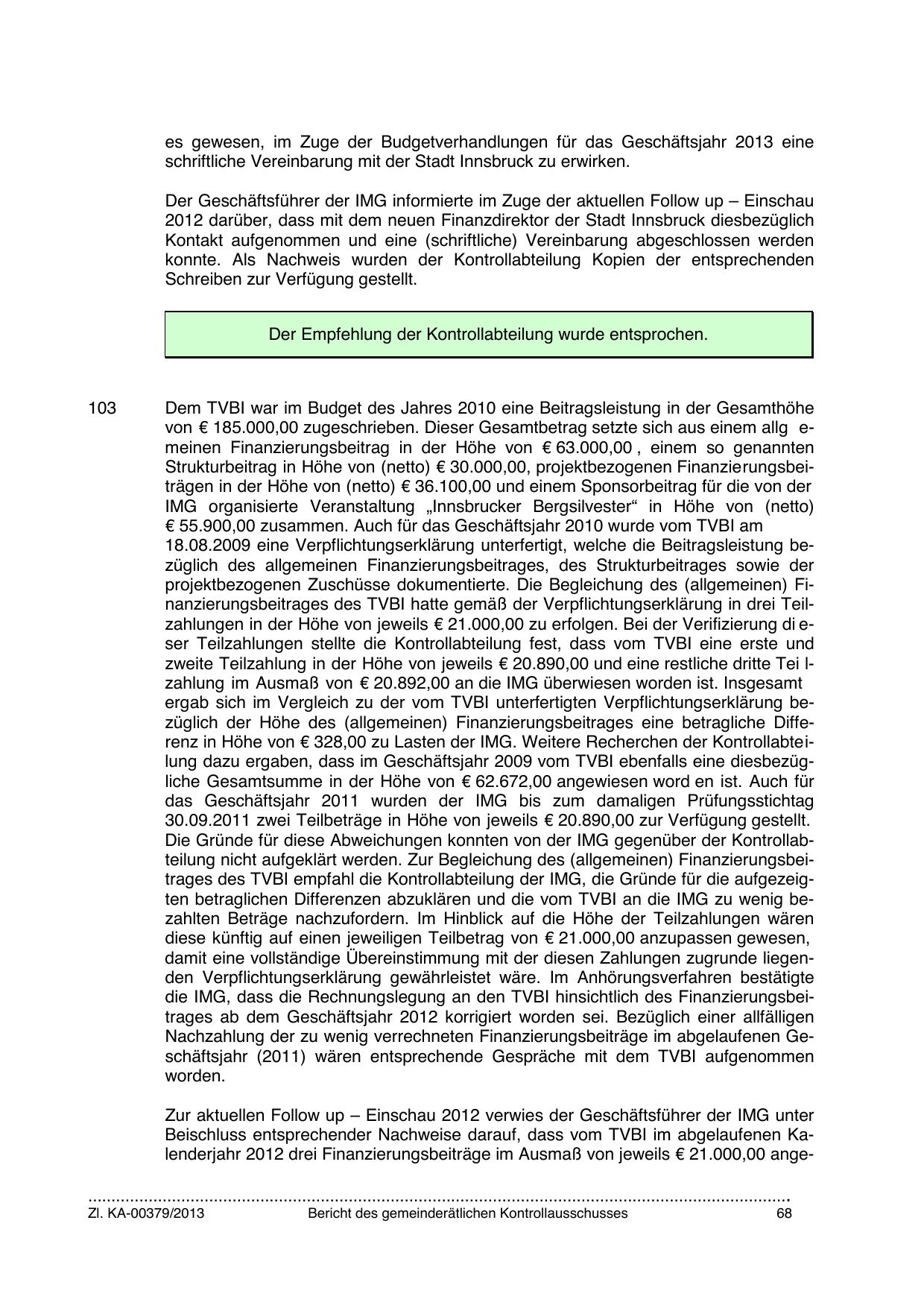 projektbezogenen Zuschüsse dokumentierte. Die Begleichung des (allgemeinen) Finanzierungsbeitrages des TVBI hatte gemäß der Verpflichtungserklärung in drei Teilzahlungen in der Höhe von jeweils € 21.000,00 zu erfolgen. Bei der Verifizierung di eser Teilzahlungen stellte die Kontrollabteilung fest, dass vom TVBI eine erste und
