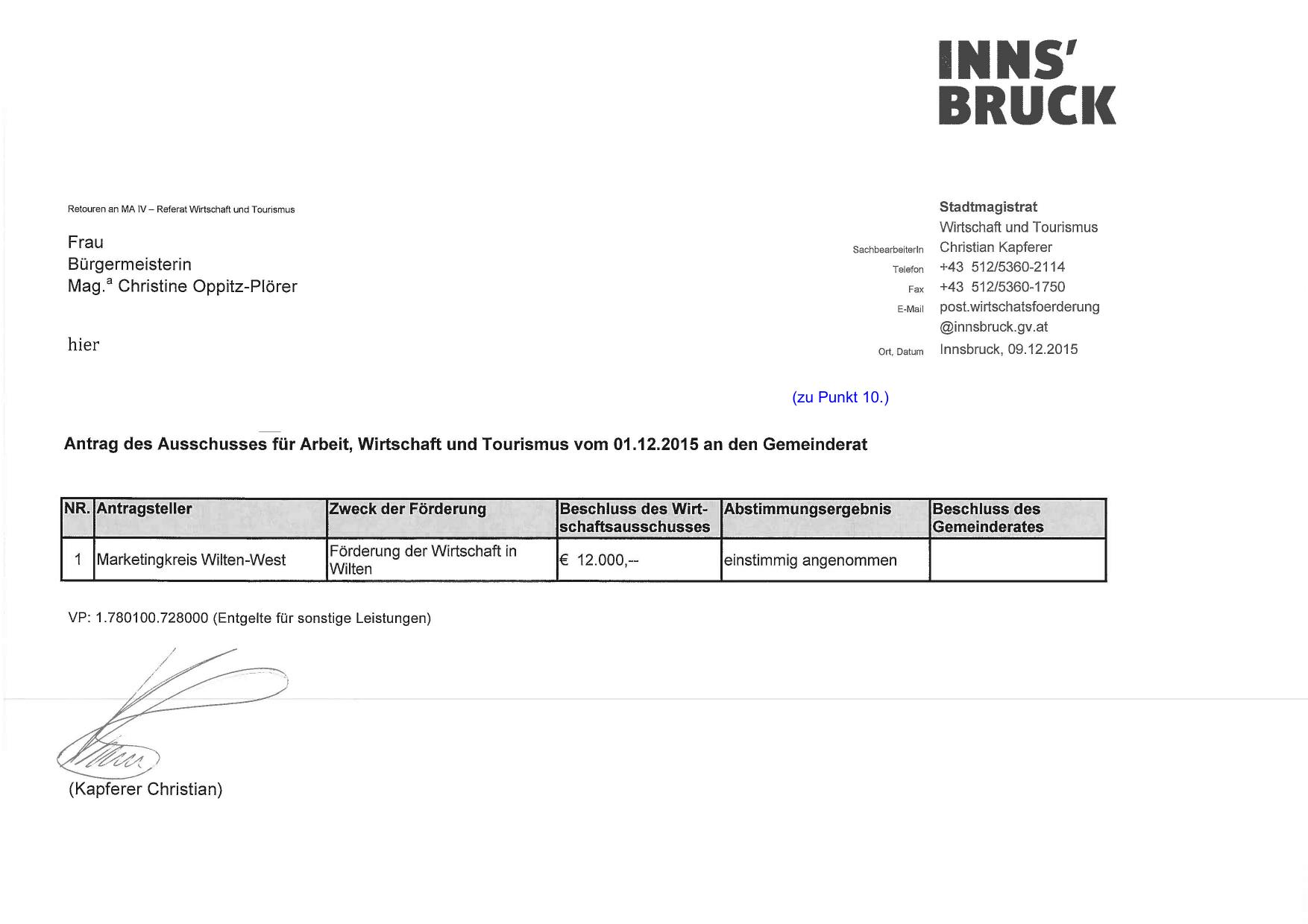Antrag des Ausschusses für Arbeit, Wirtschaft und Tourismus vom 01.12.2015 an den Gemeinderat