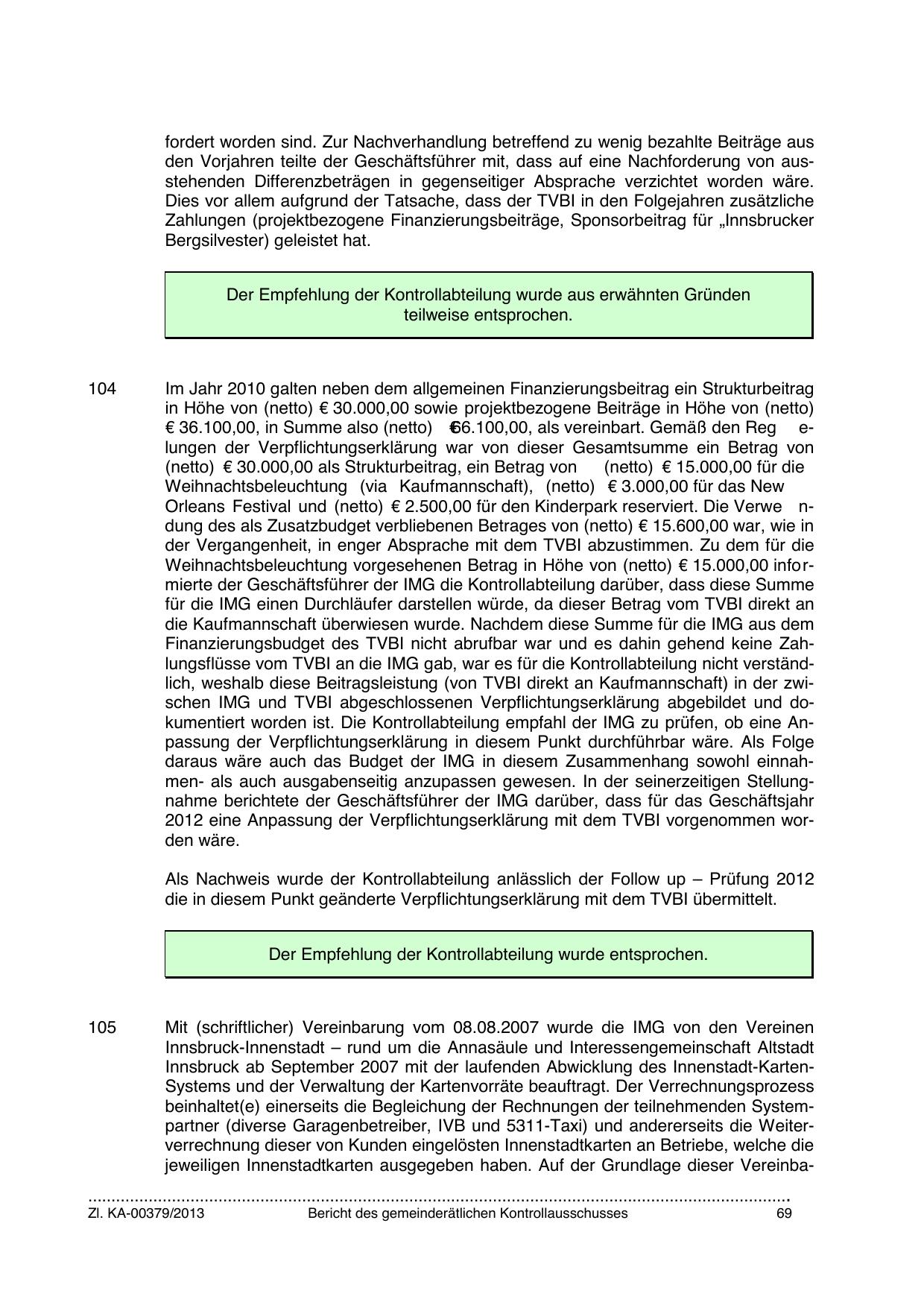 Finanzierungsbudget des TVBI nicht abrufbar war und es dahin gehend keine Zahlungsflüsse vom TVBI an die IMG gab, war es für die Kontrollabteilung nicht verständlich, weshalb diese Beitragsleistung (von TVBI direkt an Kaufmannschaft) in der zwischen IMG und TVBI abgeschlossenen Verpflichtungserklärung abgebildet und dokumentiert worden ist. Die Kontrollabteilung empfahl der IMG zu prüfen, ob eine Anpassung der Verpflichtungserklärung in diesem Punkt durchführbar wäre. Als Folge