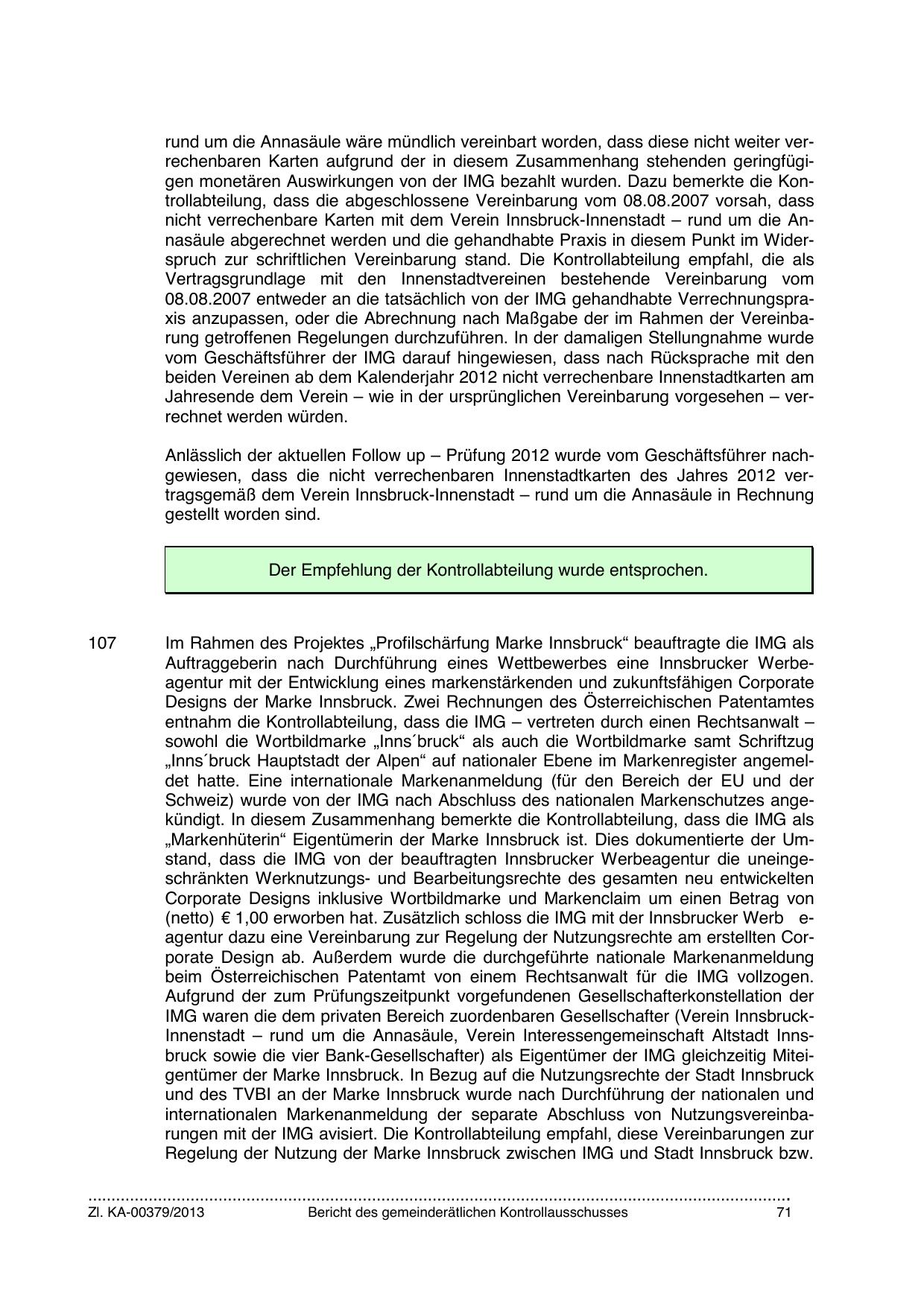 Anlässlich der aktuellen Follow up – Prüfung 2012 wurde vom Geschäftsführer nachgewiesen, dass die nicht verrechenbaren Innenstadtkarten des Jahres 2012 vertragsgemäß dem Verein Innsbruck-Innenstadt – rund um die Annasäule in Rechnung