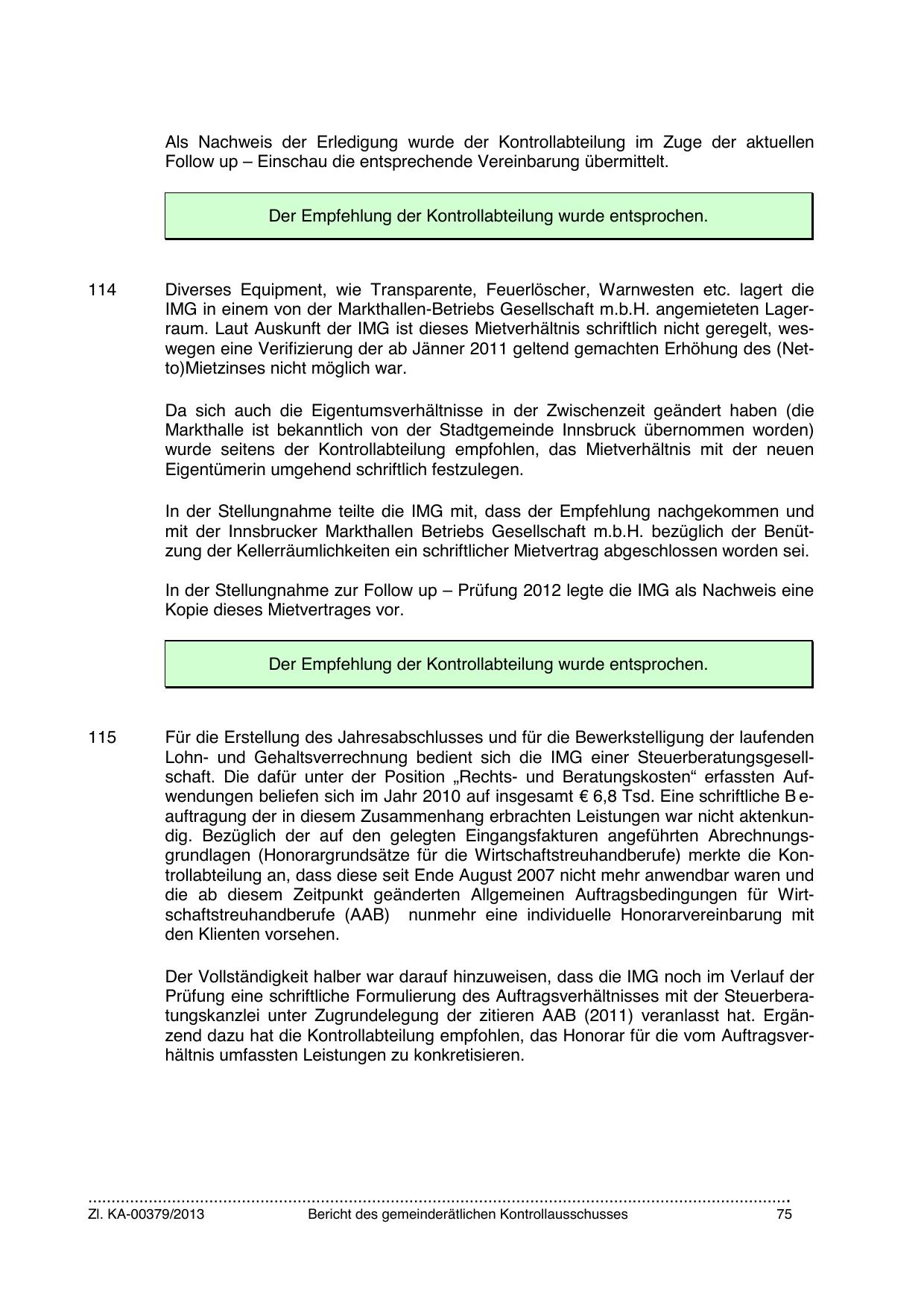 Prüfung eine schriftliche Formulierung des Auftragsverhältnisses mit der Steuerberatungskanzlei unter Zugrundelegung der zitieren AAB (2011) veranlasst hat. Ergänzend dazu hat die Kontrollabteilung empfohlen, das Honorar für die vom Auftragsverhältnis umfassten Leistungen zu konkretisieren.