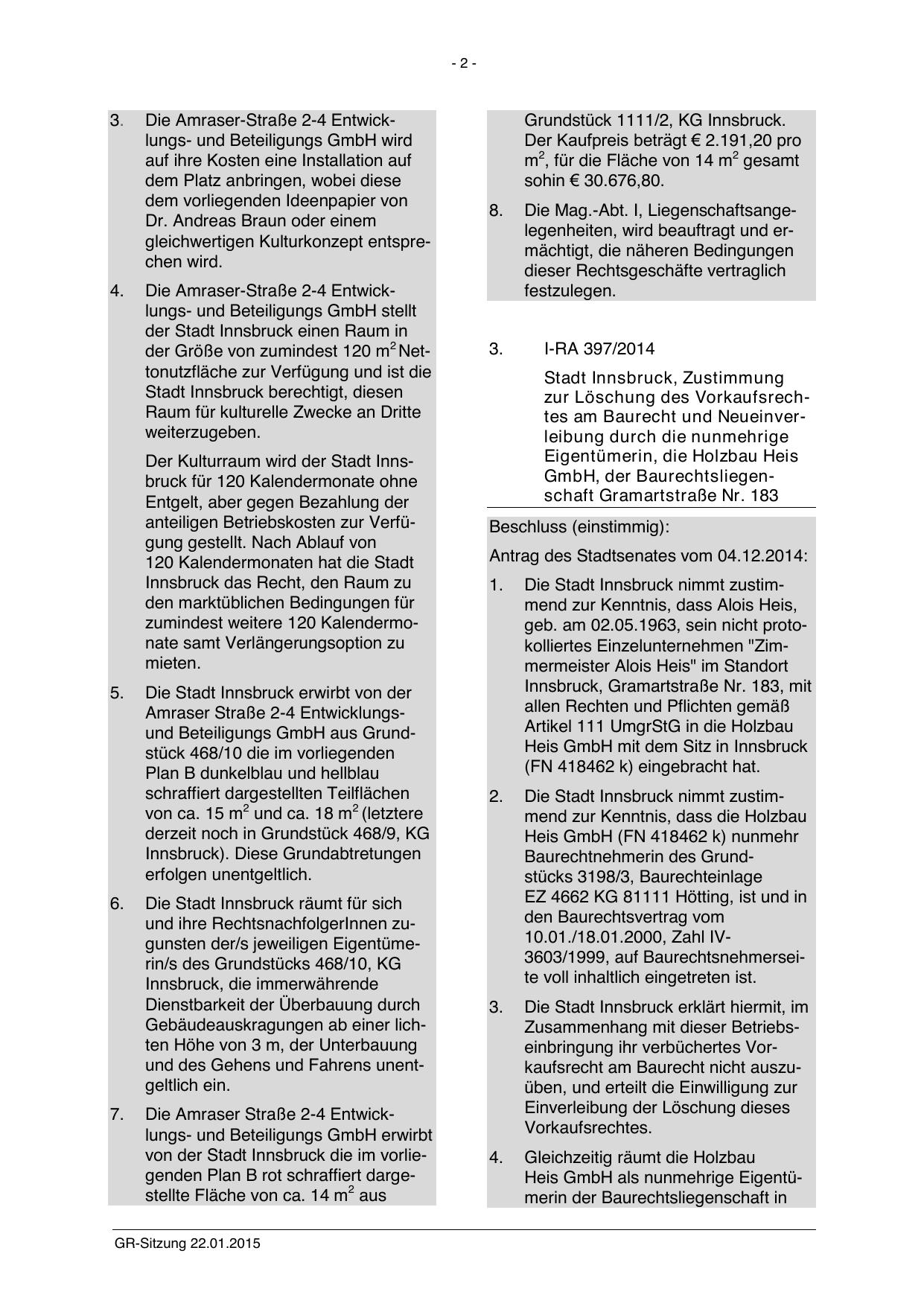 Die Stadt Innsbruck nimmt zustimmend zur Kenntnis, dass Alois Heis,