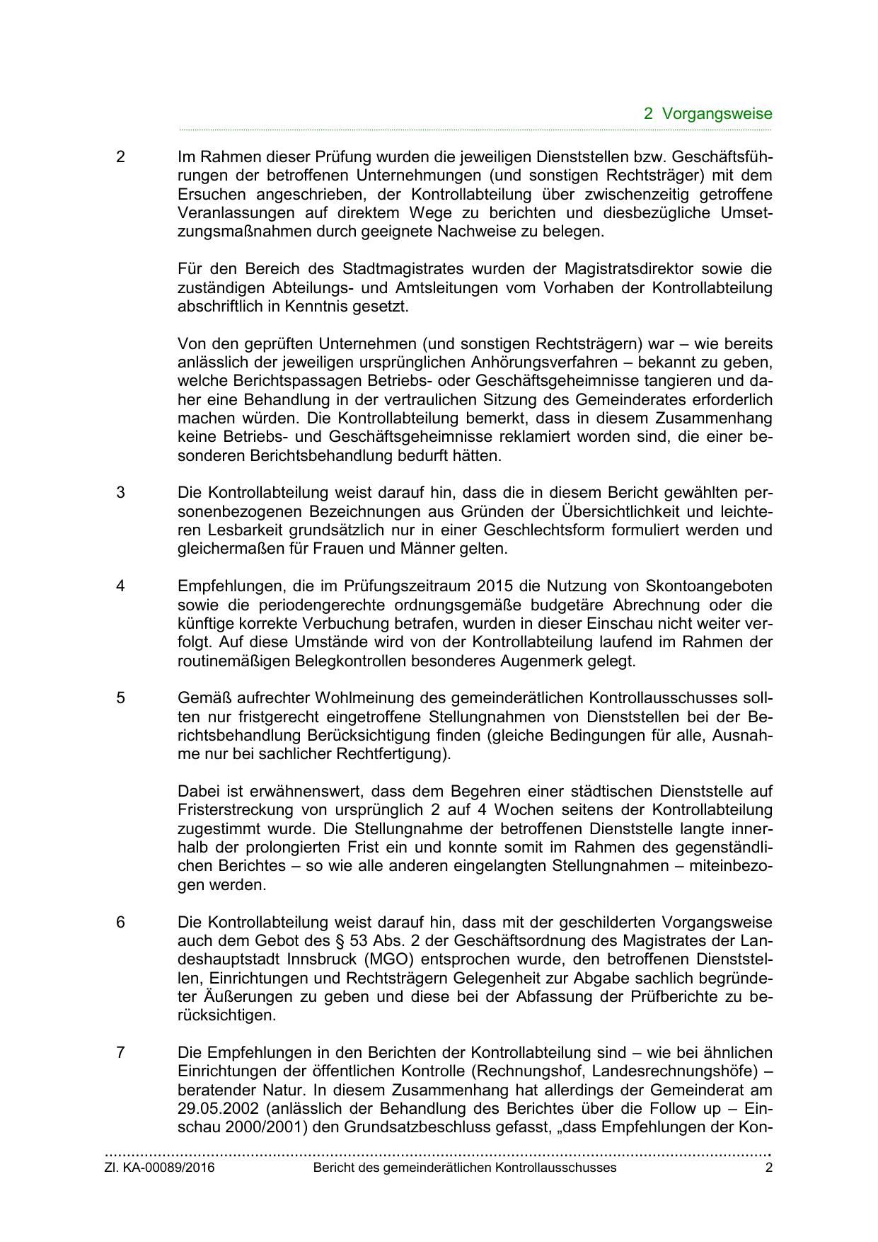 auch dem Gebot des § 53 Abs. 2 der Geschäftsordnung des Magistrates der Landeshauptstadt Innsbruck (MGO) entsprochen wurde, den betroffenen Dienststellen, Einrichtungen und Rechtsträgern Gelegenheit zur Abgabe sachlich begründeter Äußerungen zu geben und diese bei der Abfassung der Prüfberichte zu berücksichtigen.