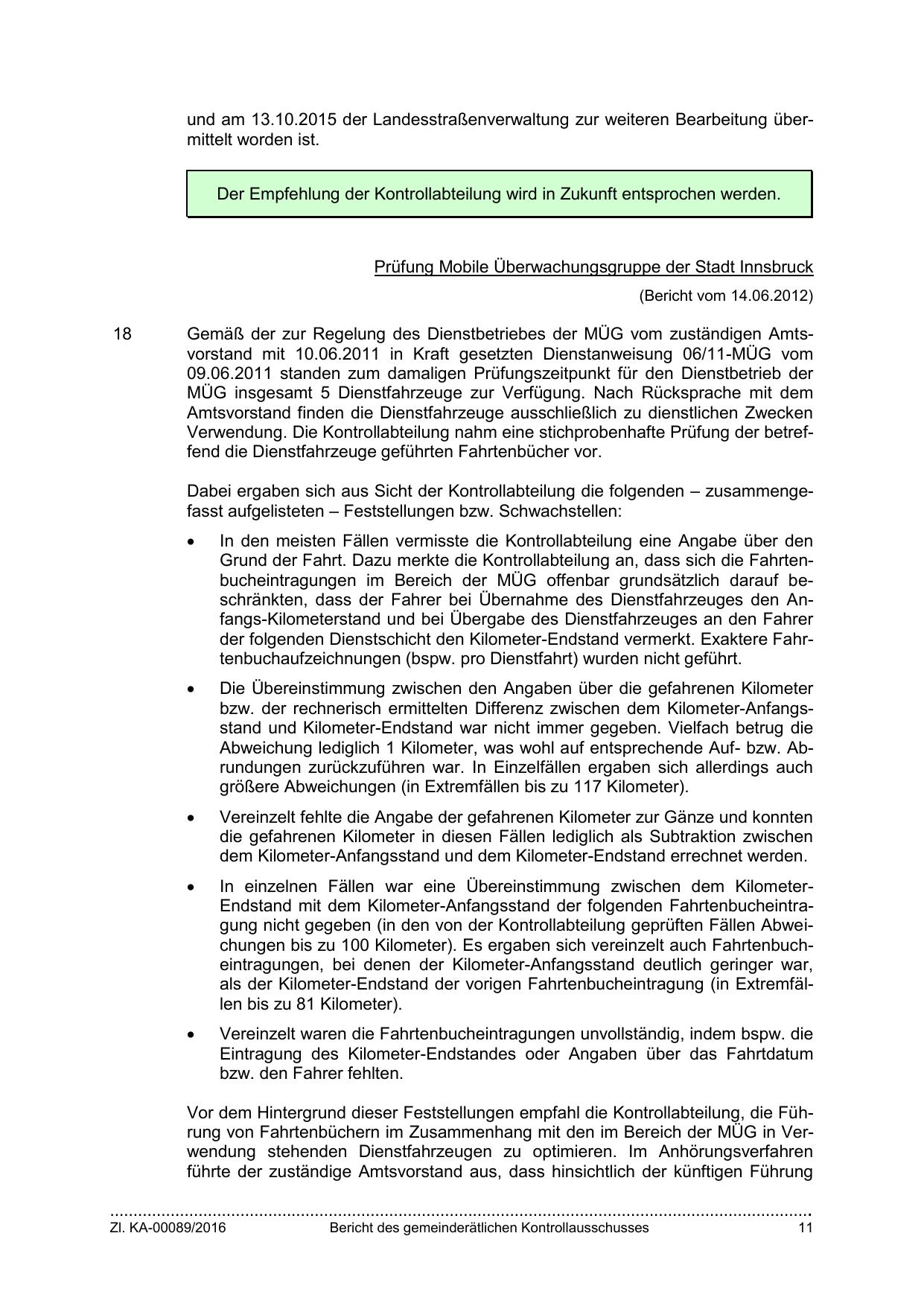 Vor dem Hintergrund dieser Feststellungen empfahl die Kontrollabteilung, die Führung von Fahrtenbüchern im Zusammenhang mit den im Bereich der MÜG in Verwendung stehenden Dienstfahrzeugen zu optimieren. Im Anhörungsverfahren