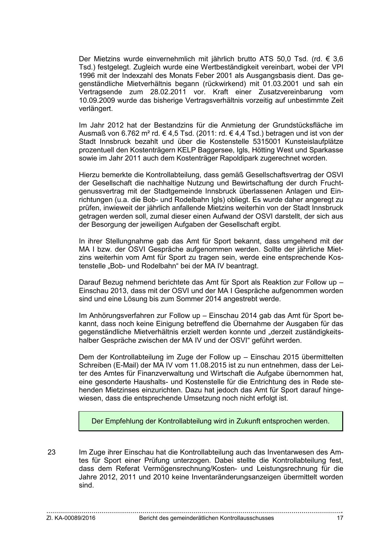 MA I bzw. der OSVI Gespräche aufgenommen werden. Sollte der jährliche Mietzins weiterhin vom Amt für Sport zu tragen sein, werde eine entsprechende Kostenstelle „Bob- und Rodelbahn“ bei der MA IV beantragt.