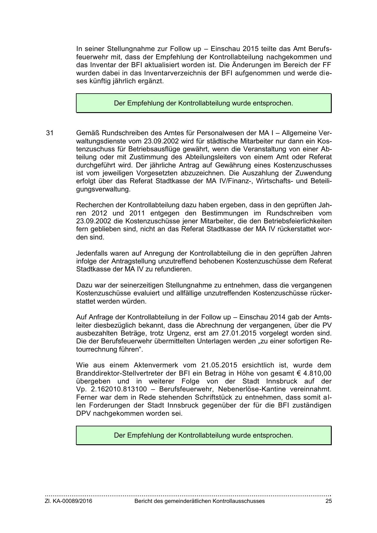 In seiner Stellungnahme zur Follow up – Einschau 2015 teilte das Amt Berufsfeuerwehr mit, dass der Empfehlung der Kontrollabteilung nachgekommen und