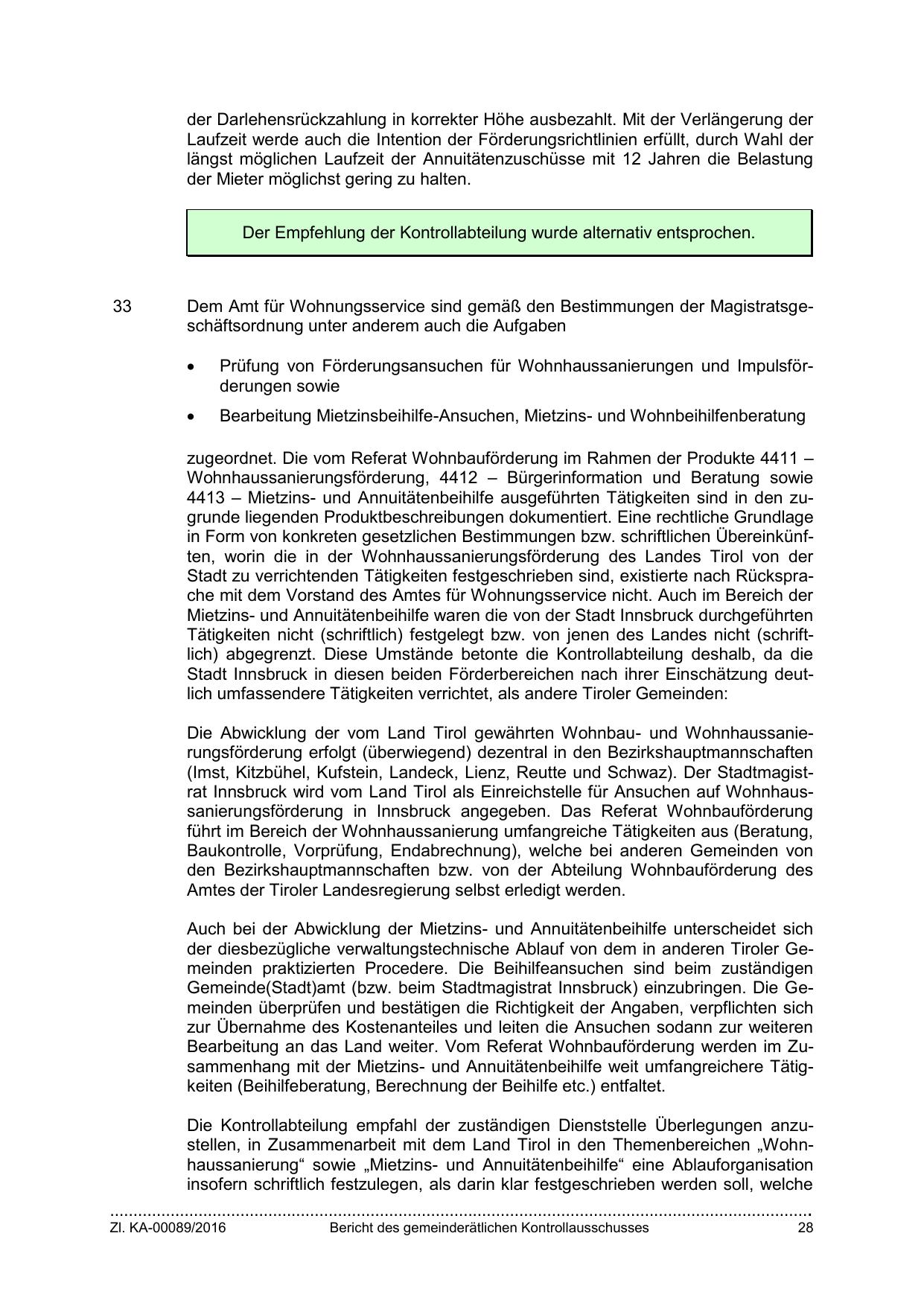 Die Kontrollabteilung empfahl der zuständigen Dienststelle Überlegungen anzustellen, in Zusammenarbeit mit dem Land Tirol in den Themenbereichen „Wohnhaussanierung“ sowie „Mietzins- und Annuitätenbeihilfe“ eine Ablauforganisation