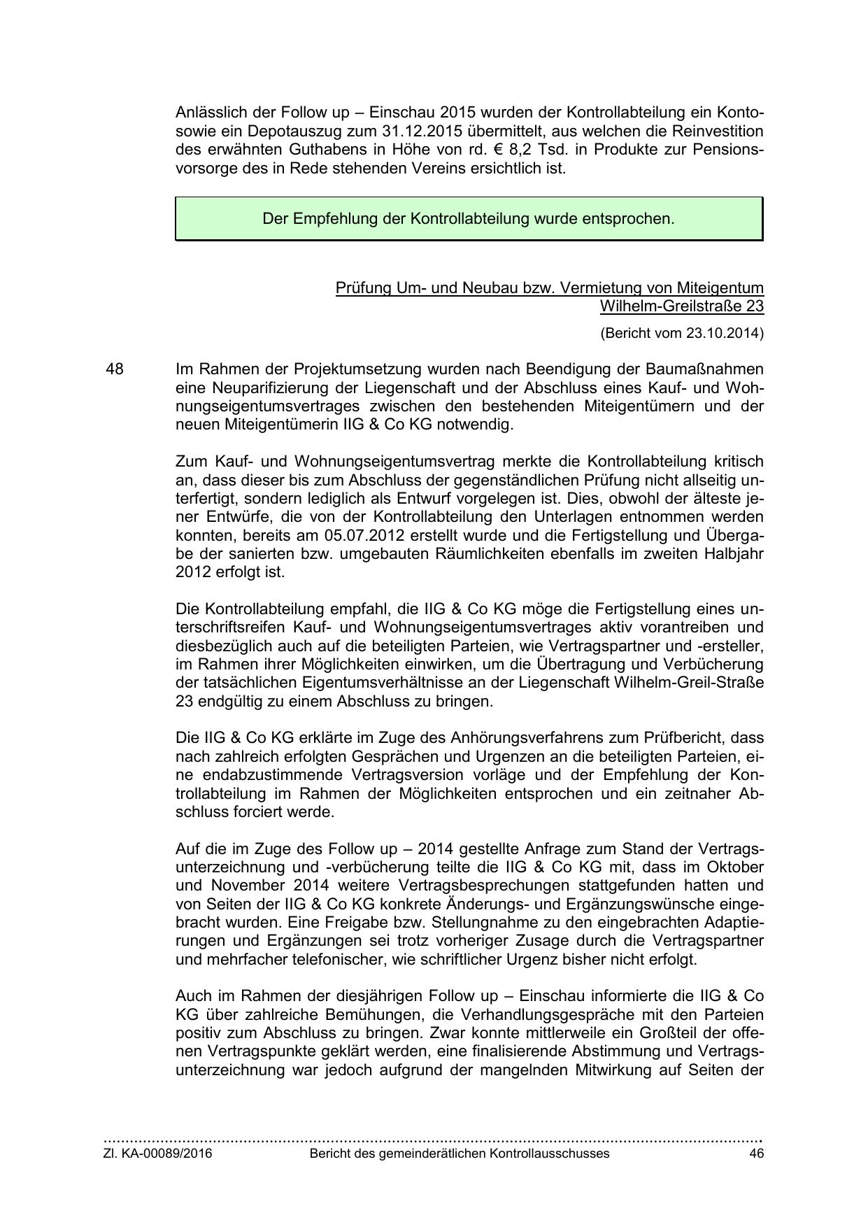 Auf die im Zuge des Follow up – 2014 gestellte Anfrage zum Stand der Vertragsunterzeichnung und -verbücherung teilte die IIG & Co KG mit, dass im Oktober
