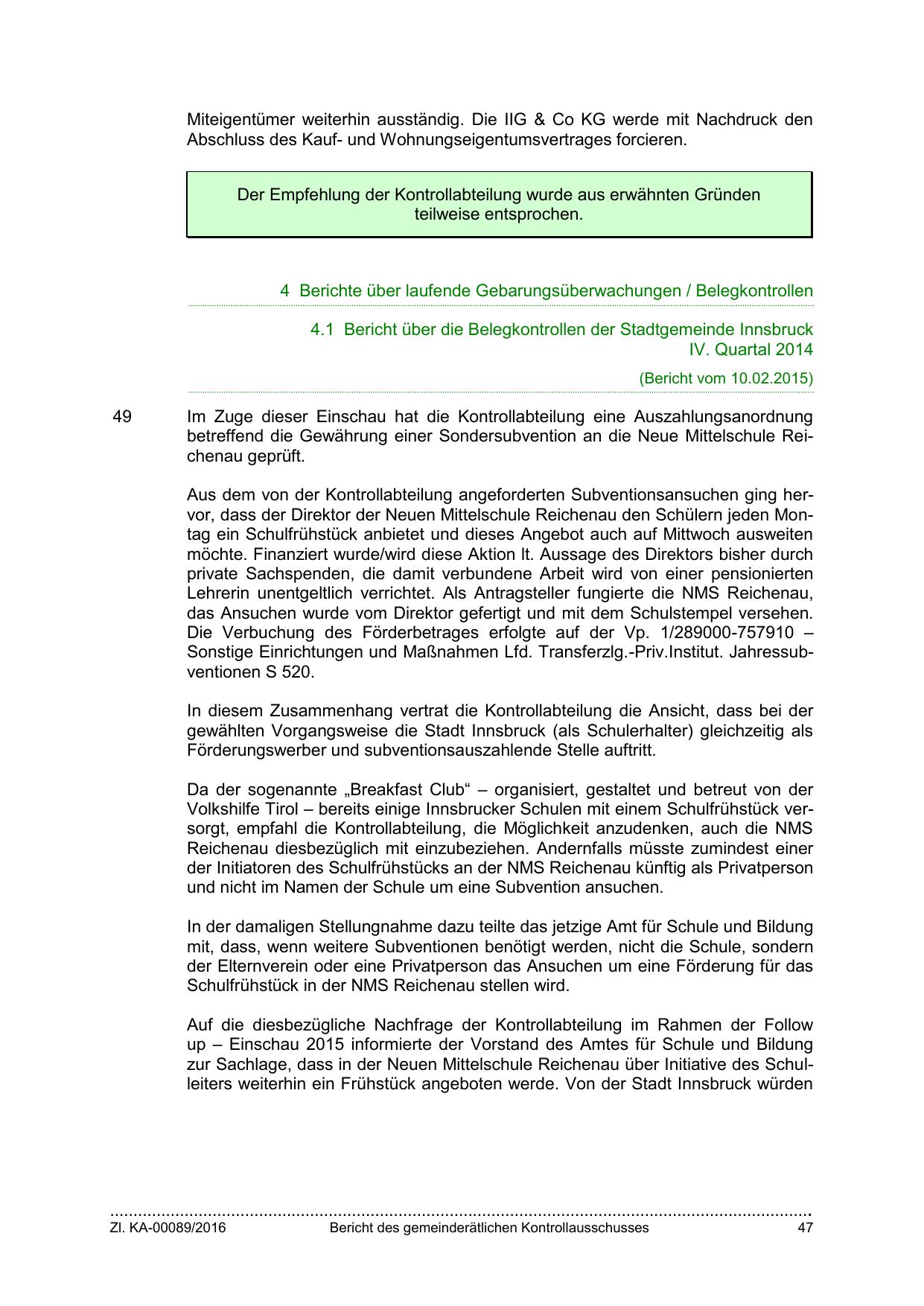 4.1 Bericht über die Belegkontrollen der Stadtgemeinde Innsbruck