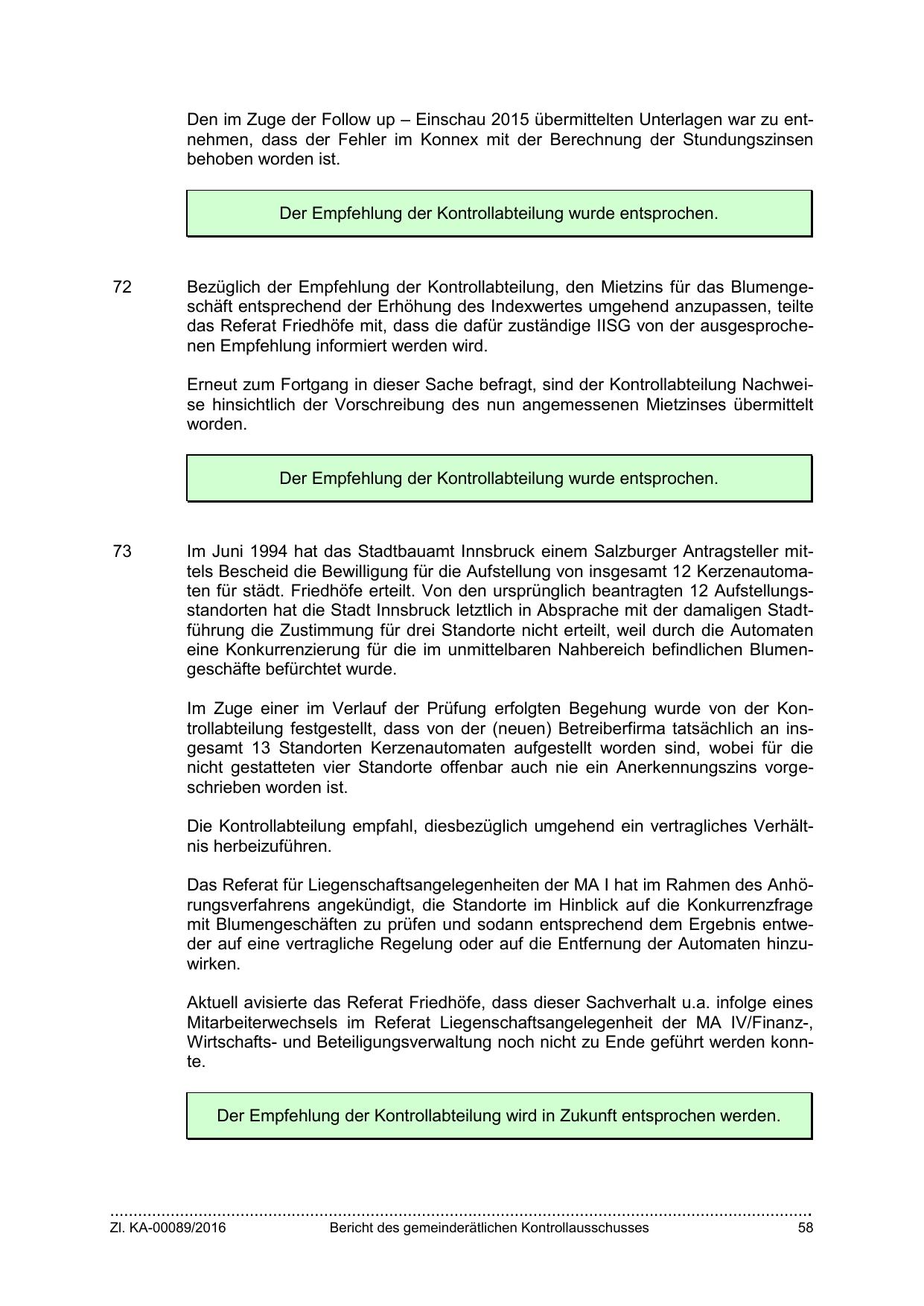 Erneut zum Fortgang in dieser Sache befragt, sind der Kontrollabteilung Nachweise hinsichtlich der Vorschreibung des nun angemessenen Mietzinses übermittelt