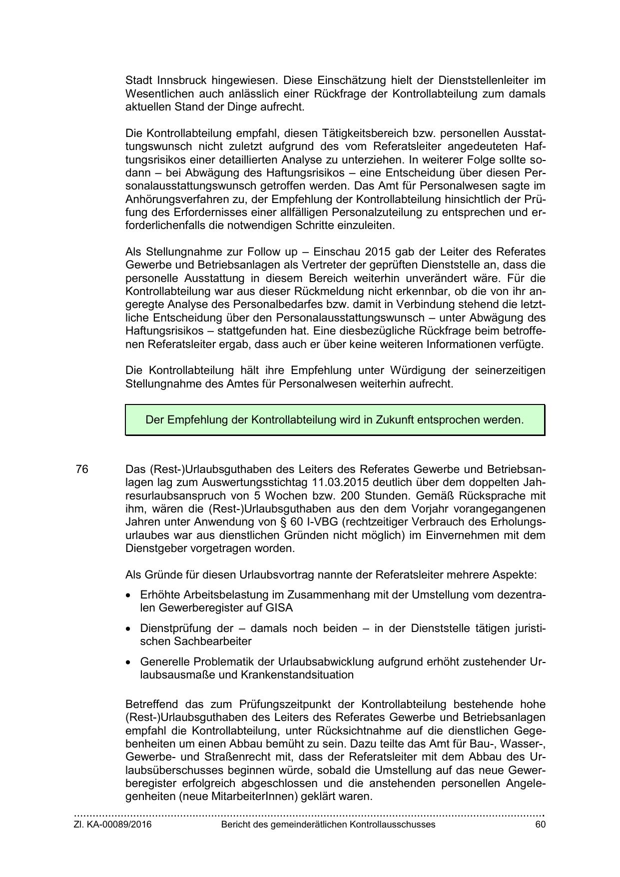 Die Kontrollabteilung empfahl, diesen Tätigkeitsbereich bzw. personellen Ausstattungswunsch nicht zuletzt aufgrund des vom Referatsleiter angedeuteten Haftungsrisikos einer detaillierten Analyse zu unterziehen. In weiterer Folge sollte sodann – bei Abwägung des Haftungsrisikos – eine Entscheidung über diesen Personalausstattungswunsch getroffen werden. Das Amt für Personalwesen sagte im