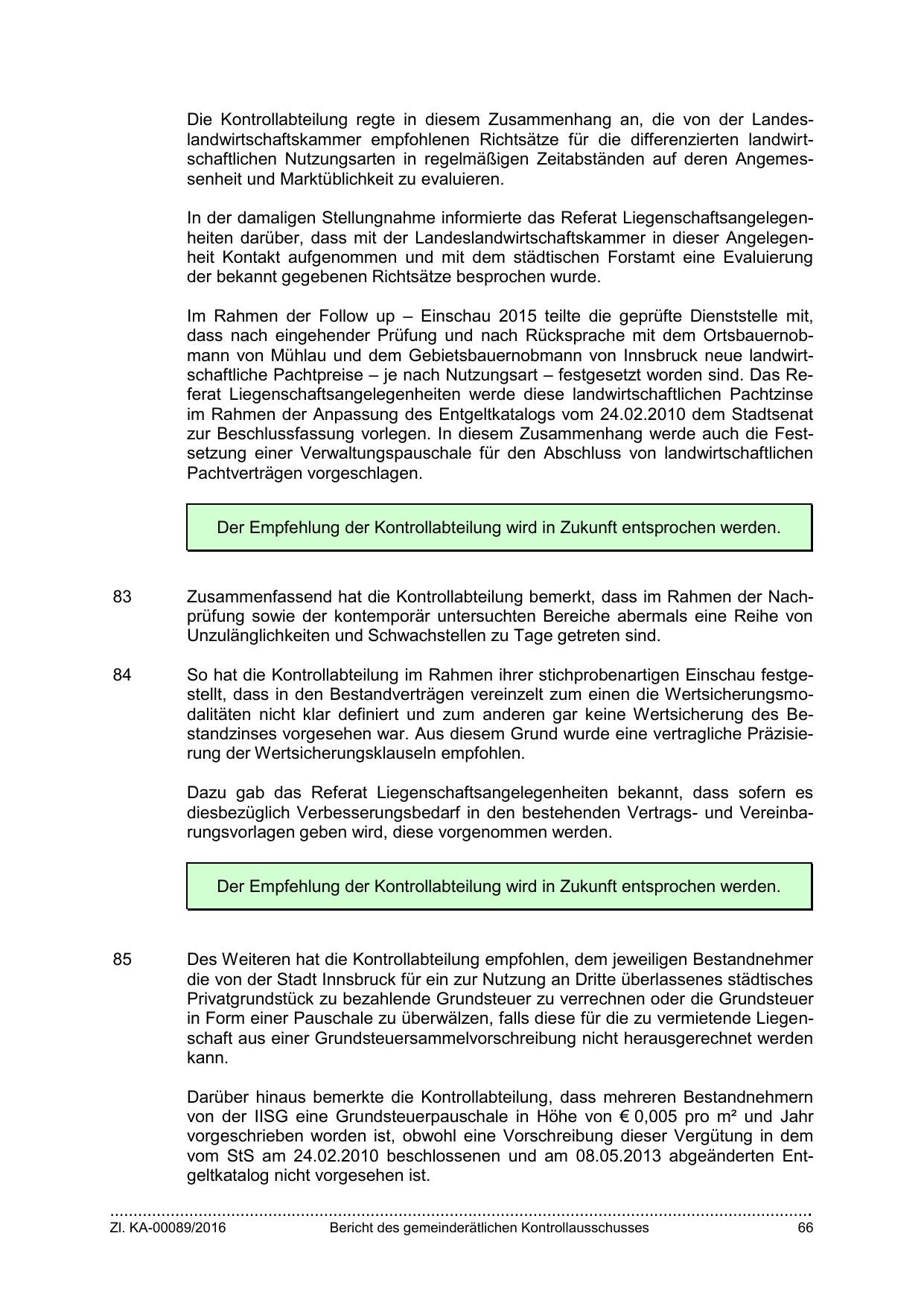 Die Kontrollabteilung regte in diesem Zusammenhang an, die von der Landeslandwirtschaftskammer empfohlenen Richtsätze für die differenzierten landwirtschaftlichen Nutzungsarten in regelmäßigen Zeitabständen auf deren Angemessenheit und Marktüblichkeit zu evaluieren.