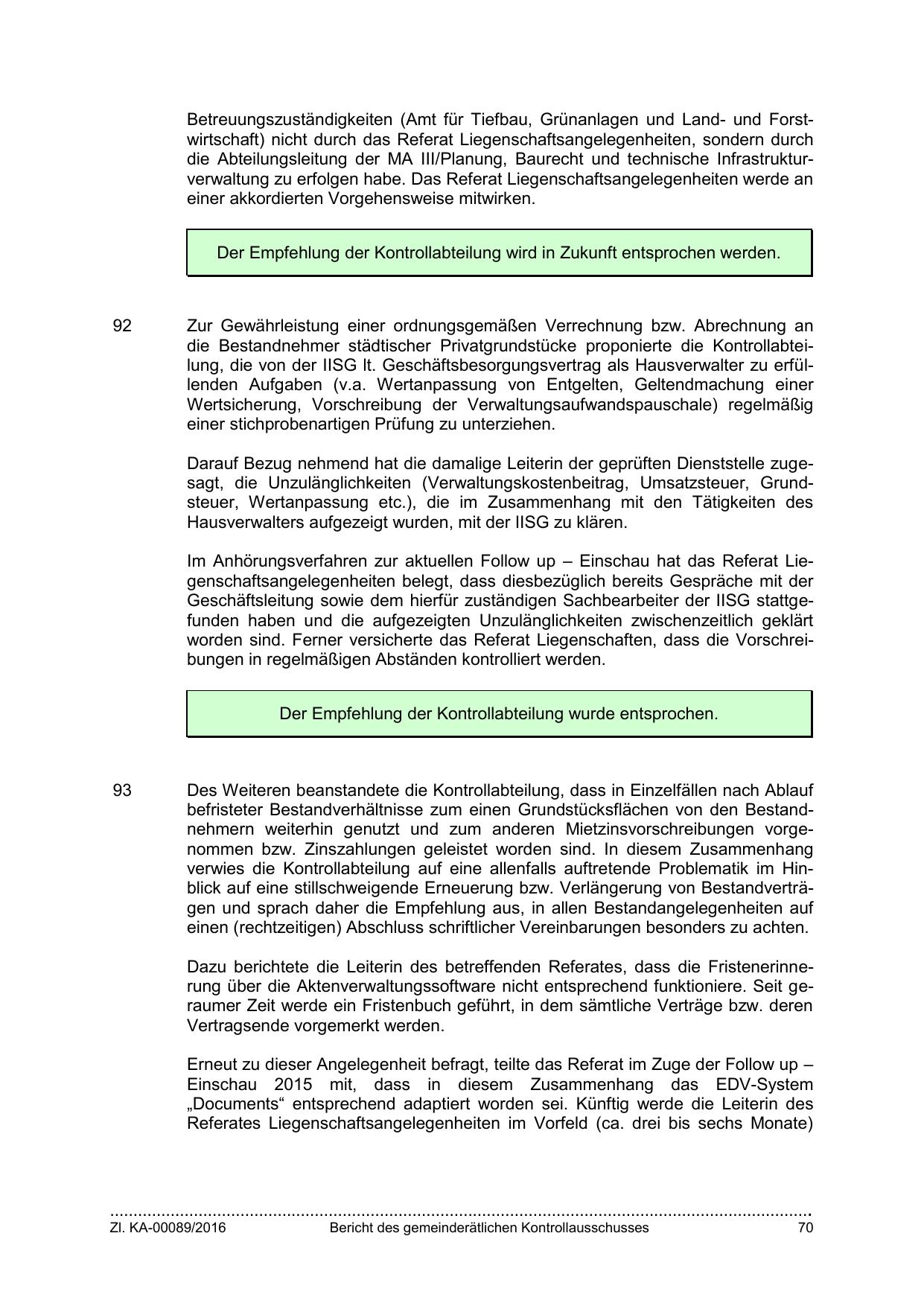 die Bestandnehmer städtischer Privatgrundstücke proponierte die Kontrollabteilung, die von der IISG lt. Geschäftsbesorgungsvertrag als Hausverwalter zu erfüllenden Aufgaben (v.a. Wertanpassung von Entgelten, Geltendmachung einer