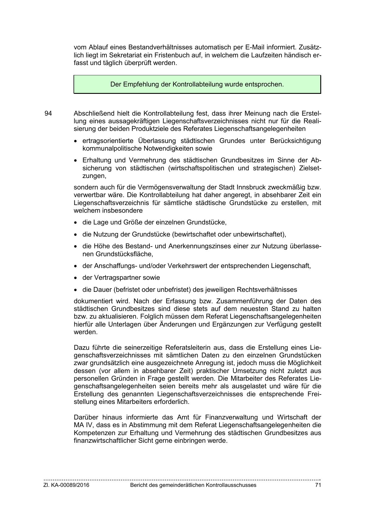 Abschließend hielt die Kontrollabteilung fest, dass ihrer Meinung nach die Erstellung eines aussagekräftigen Liegenschaftsverzeichnisses nicht nur für die Realisierung der beiden Produktziele des Referates Liegenschaftsangelegenheiten