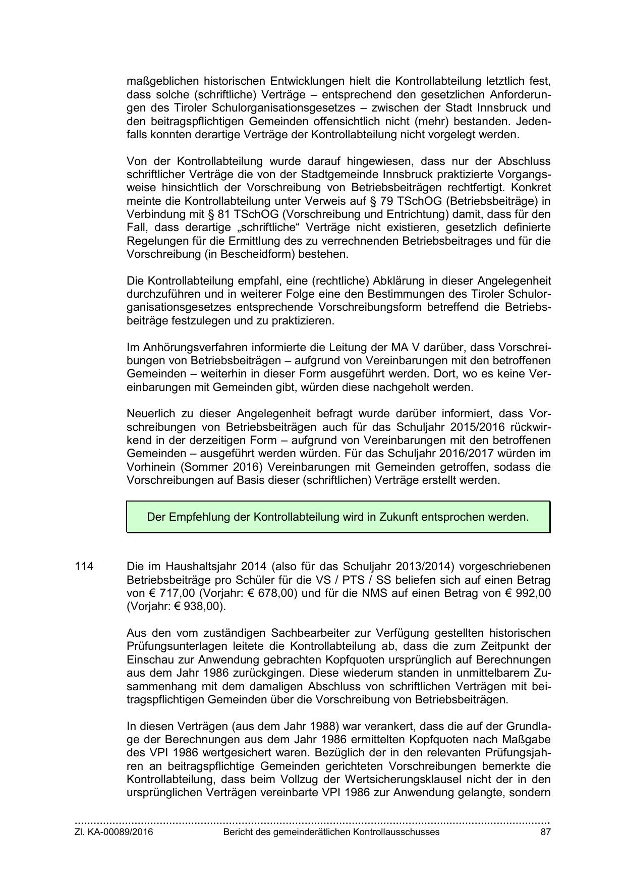 durchzuführen und in weiterer Folge eine den Bestimmungen des Tiroler Schulorganisationsgesetzes entsprechende Vorschreibungsform betreffend die Betriebsbeiträge festzulegen und zu praktizieren.