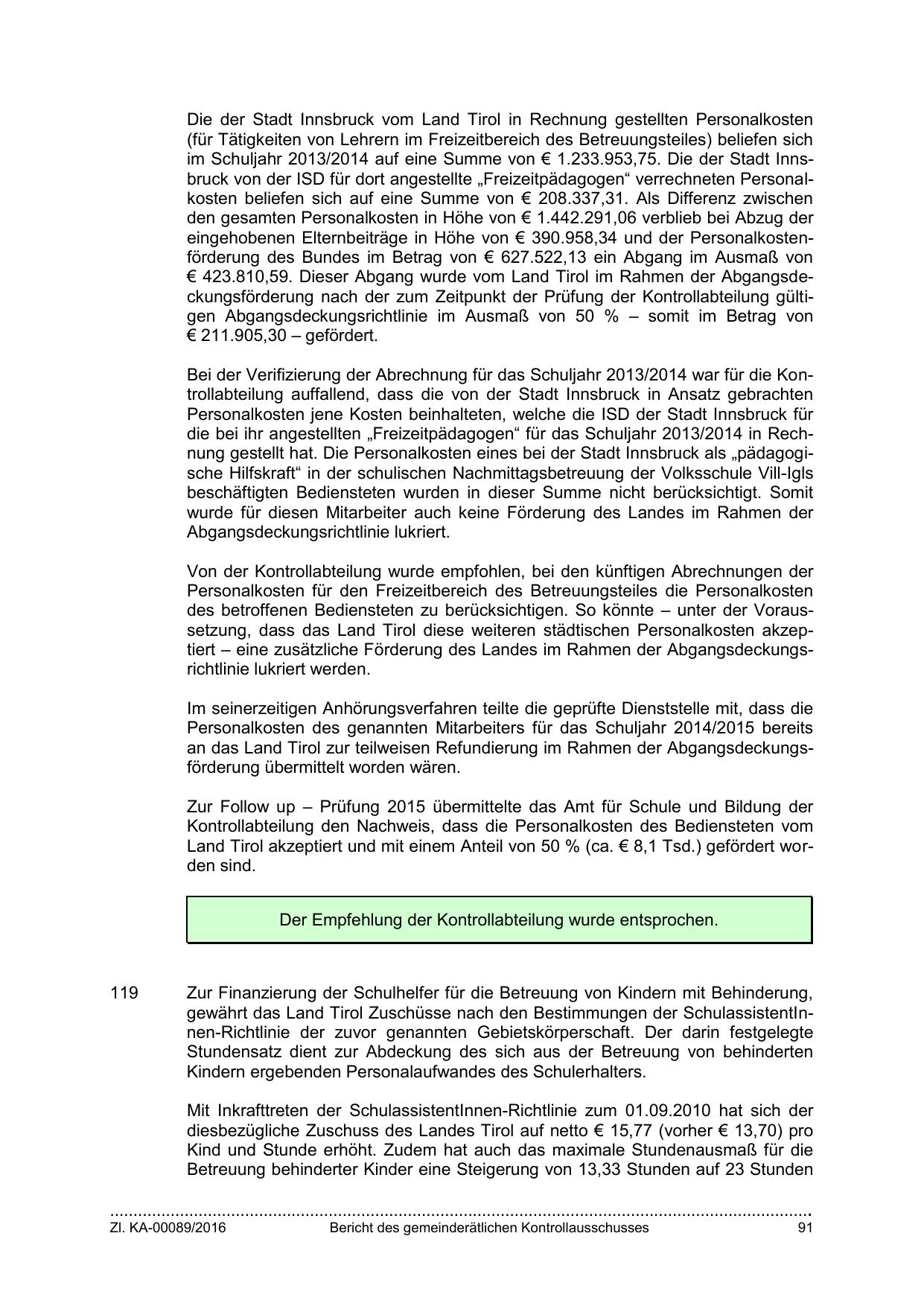 Bei der Verifizierung der Abrechnung für das Schuljahr 2013/2014 war für die Kontrollabteilung auffallend, dass die von der Stadt Innsbruck in Ansatz gebrachten