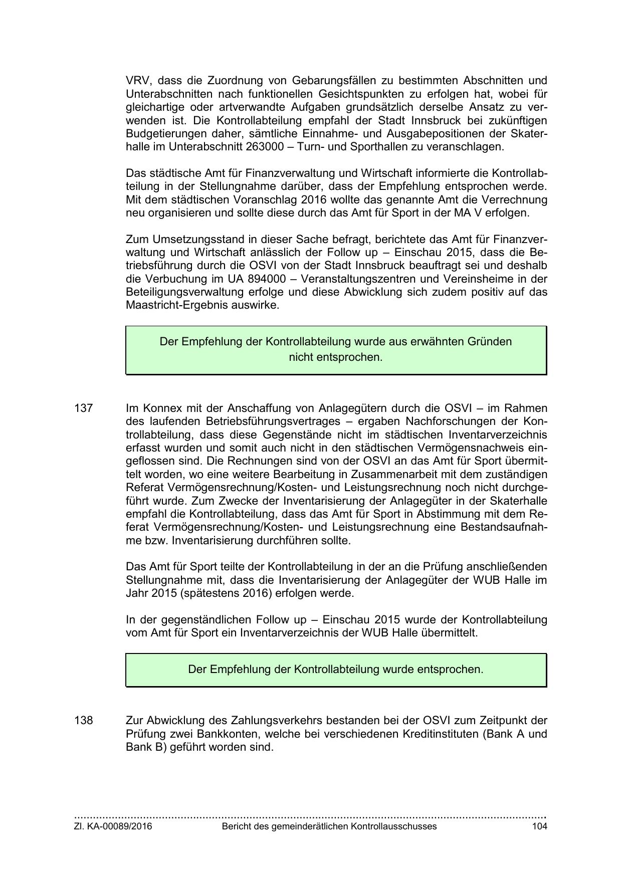 Zum Umsetzungsstand in dieser Sache befragt, berichtete das Amt für Finanzverwaltung und Wirtschaft anlässlich der Follow up – Einschau 2015, dass die Betriebsführung durch die OSVI von der Stadt Innsbruck beauftragt sei und deshalb