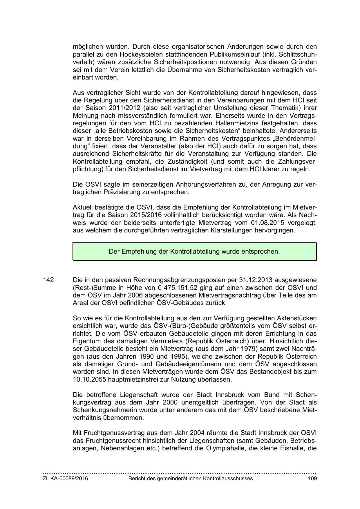 Aktuell bestätigte die OSVI, dass die Empfehlung der Kontrollabteilung im Mietvertrag für die Saison 2015/2016 vollinhaltlich berücksichtigt worden wäre. Als Nachweis wurde der beiderseits unterfertigte Mietvertrag vom 01.08.2015 vorgelegt,