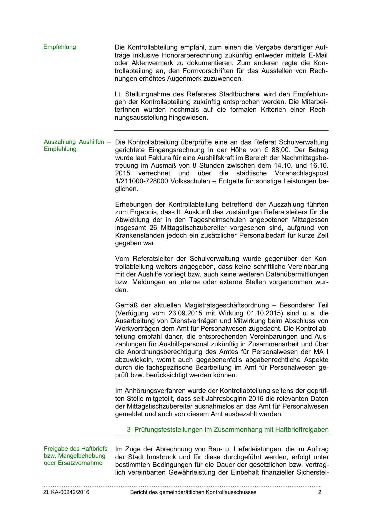 oder Aktenvermerk zu dokumentieren. Zum anderen regte die Kontrollabteilung an, den Formvorschriften für das Ausstellen von Rechnungen erhöhtes Augenmerk zuzuwenden.
