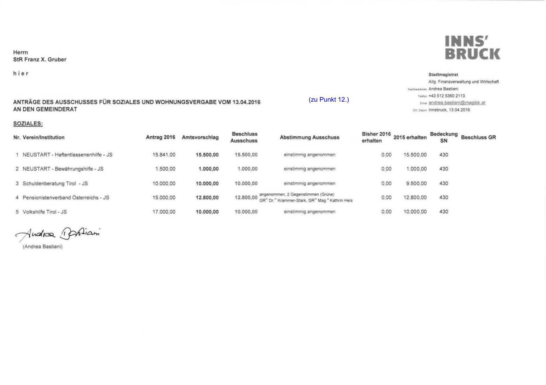 ANTRÄGE DES AUSSCHUSSES FÜR SOZIALES UNO WOHNUNGSVERGABE VOM 13.04.2016
