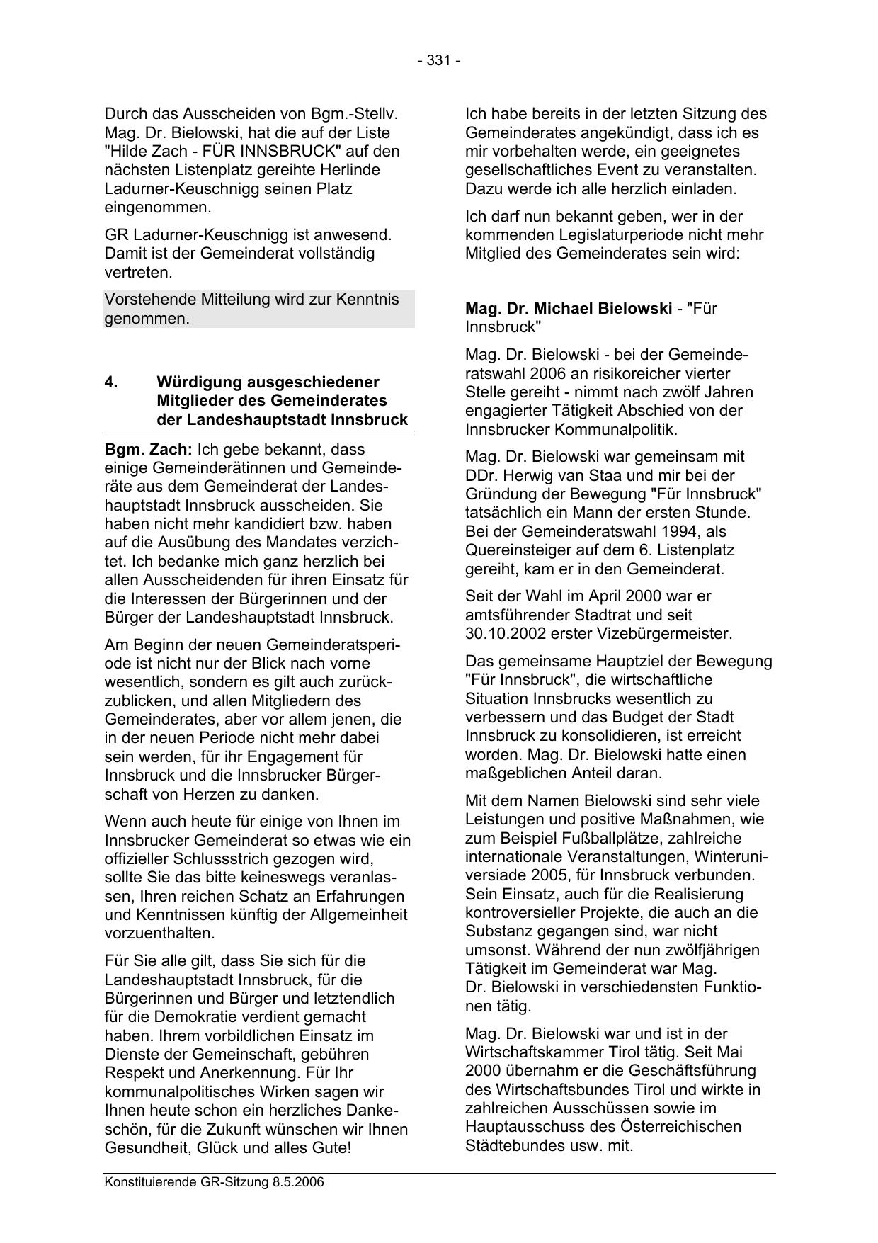 einige Gemeinderätinnen und Gemeinderäte aus dem Gemeinderat der Landeshauptstadt Innsbruck ausscheiden. Sie