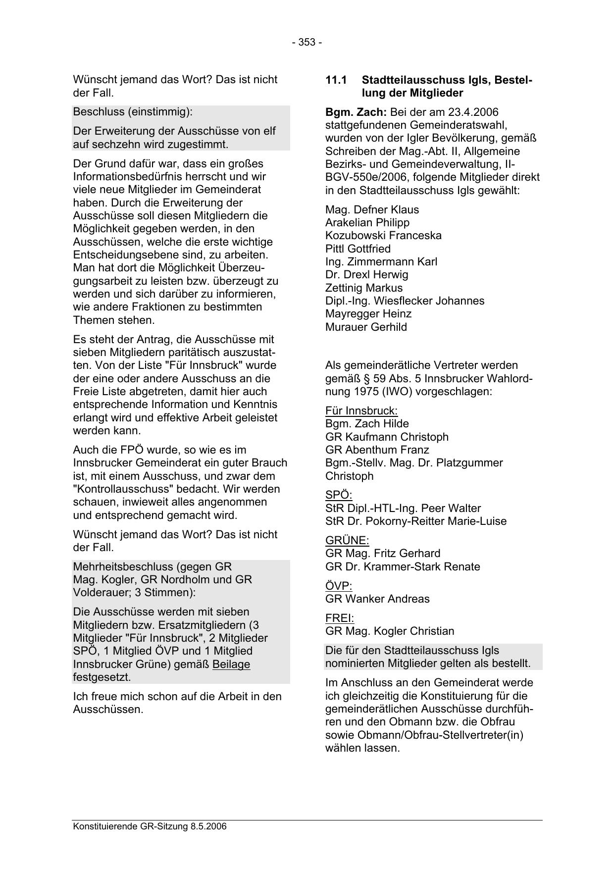 sieben Mitgliedern paritätisch auszustatten. Von der Liste "Für Innsbruck" wurde