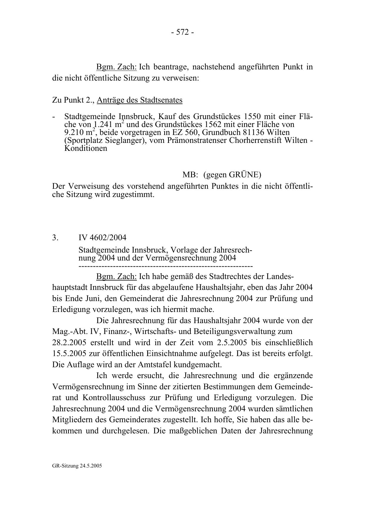 Stadtgemeinde Innsbruck, Vorlage der Jahresrechnung 2004 und der Vermögensrechnung 2004