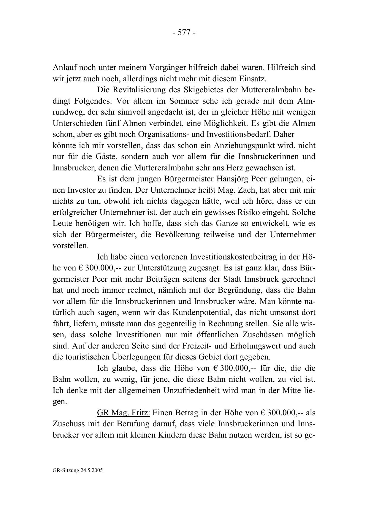 Ich habe einen verlorenen Investitionskostenbeitrag in der Höhe von € 300.000,-- zur Unterstützung zugesagt. Es ist ganz klar, dass Bürgermeister Peer mit mehr Beiträgen seitens der Stadt Innsbruck gerechnet