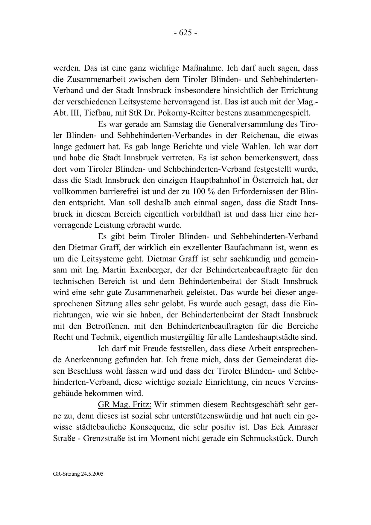 Ich darf mit Freude feststellen, dass diese Arbeit entsprechende Anerkennung gefunden hat. Ich freue mich, dass der Gemeinderat diesen Beschluss wohl fassen wird und dass der Tiroler Blinden- und Sehbehinderten-Verband, diese wichtige soziale Einrichtung, ein neues Vereinsgebäude bekommen wird.