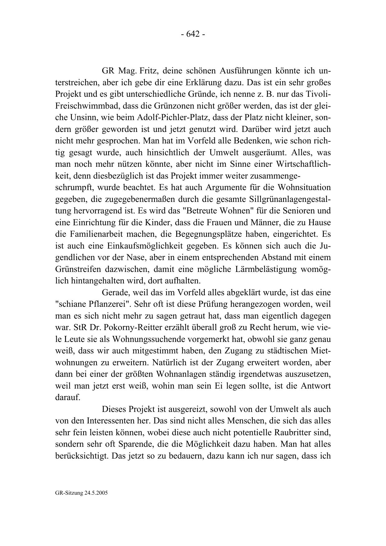 Projekt und es gibt unterschiedliche Gründe, ich nenne z. B. nur das TivoliFreischwimmbad, dass die Grünzonen nicht größer werden, das ist der gleiche Unsinn, wie beim Adolf-Pichler-Platz, dass der Platz nicht kleiner, sondern größer geworden ist und jetzt genutzt wird. Darüber wird jetzt auch