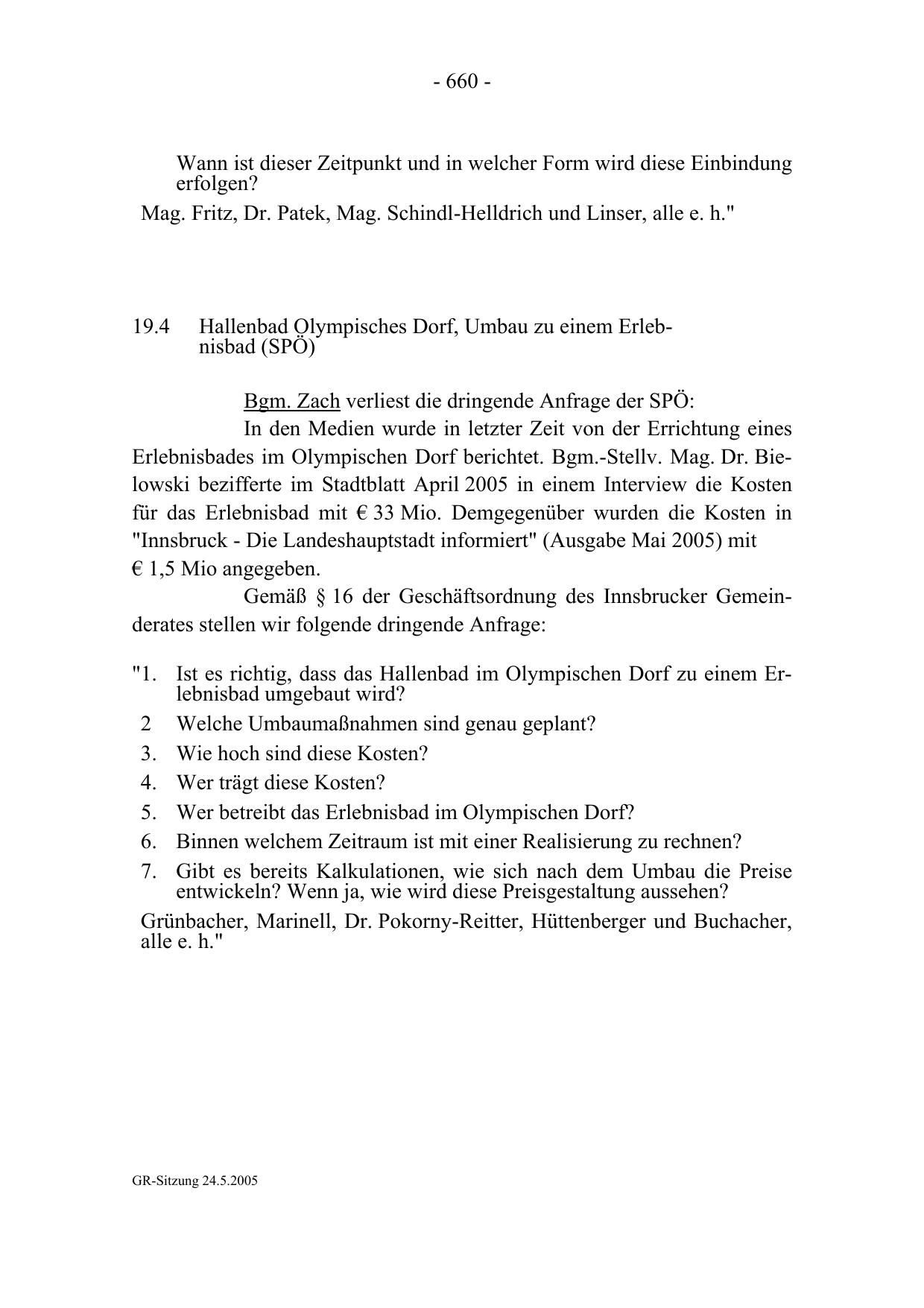 Erlebnisbades im Olympischen Dorf berichtet. Bgm.-Stellv. Mag. Dr. Bielowski bezifferte im Stadtblatt April 2005 in einem Interview die Kosten