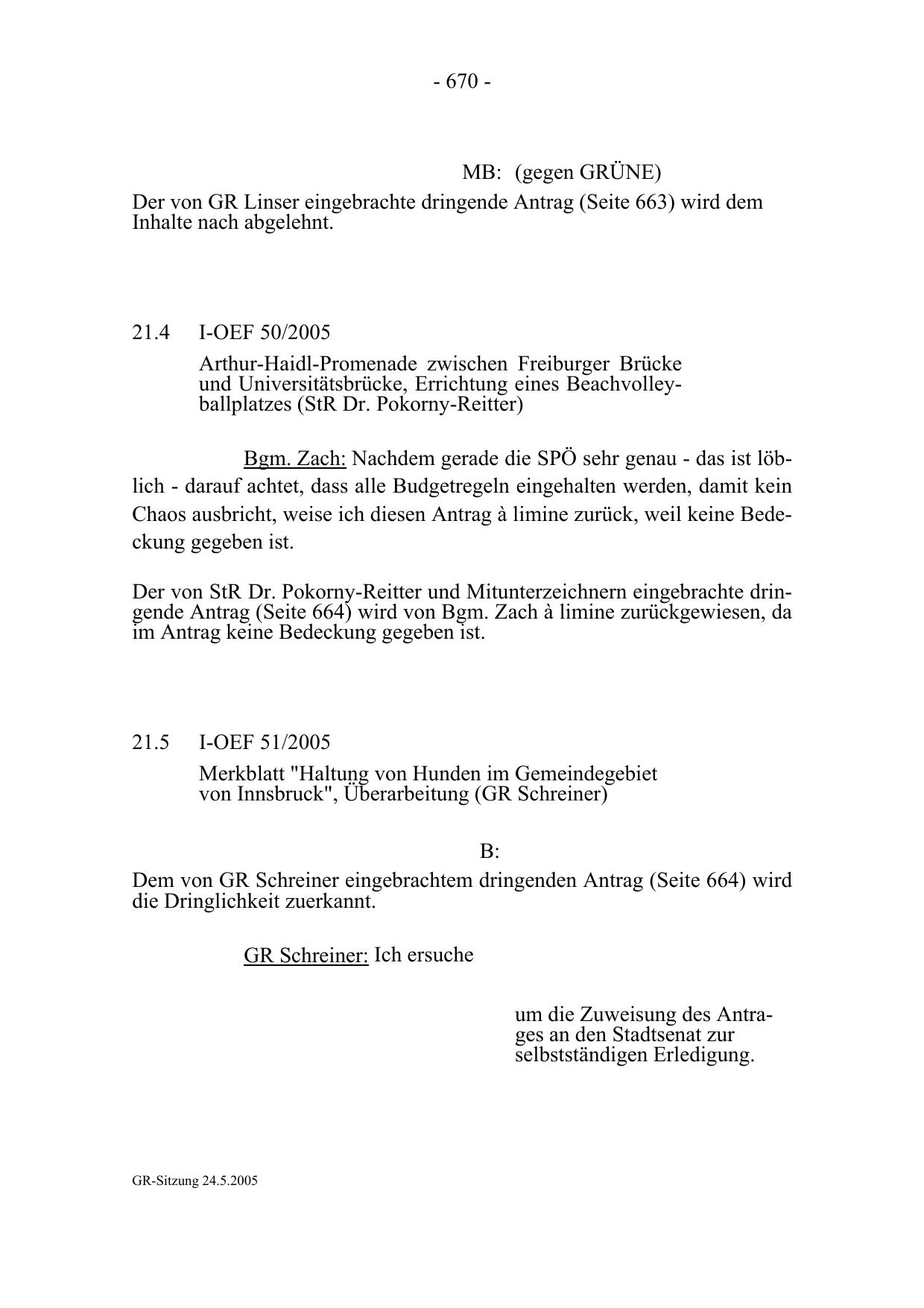 Der von GR Linser eingebrachte dringende Antrag (Seite 663) wird dem