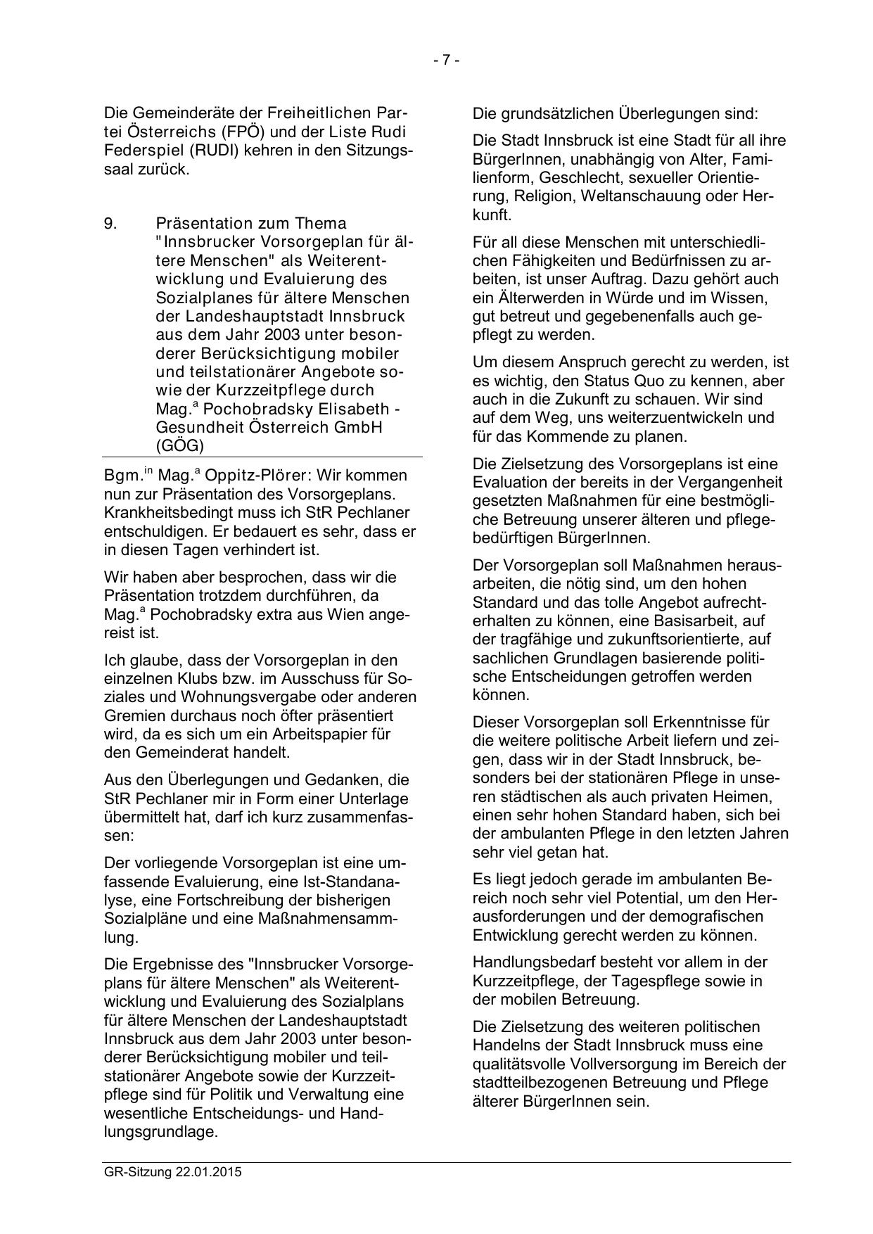 die weitere politische Arbeit liefern und zeigen, dass wir in der Stadt Innsbruck, besonders bei der stationären Pflege in unseren städtischen als auch privaten Heimen,