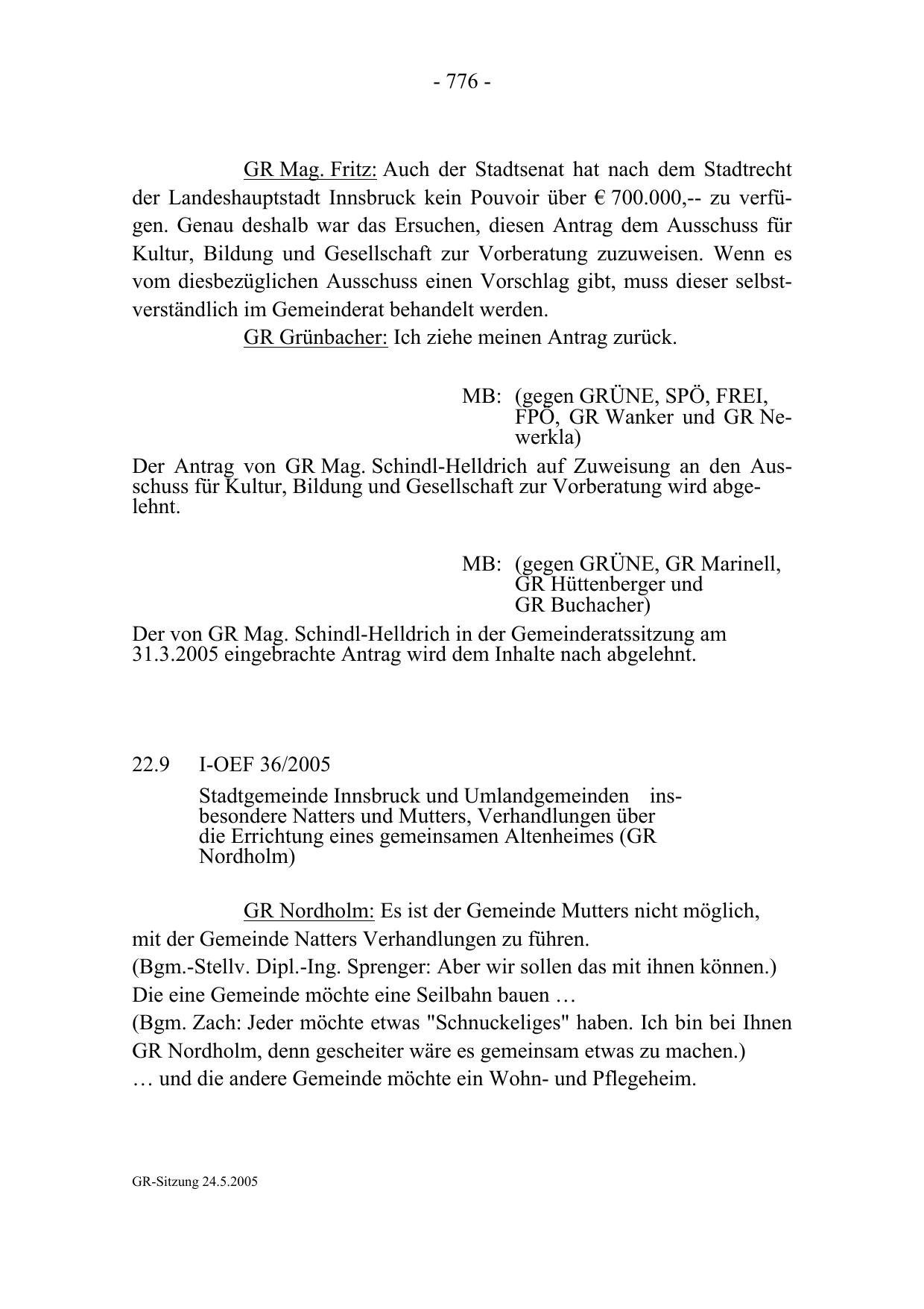 der Landeshauptstadt Innsbruck kein Pouvoir über € 700.000,-- zu verfügen. Genau deshalb war das Ersuchen, diesen Antrag dem Ausschuss für