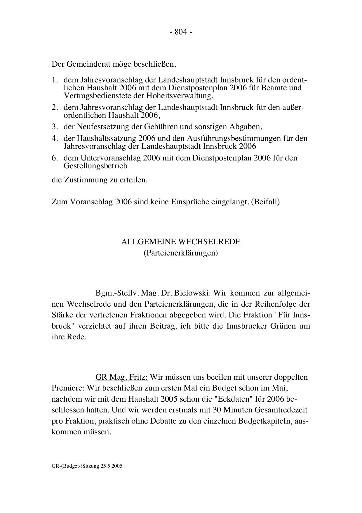 nachdem wir mit dem Haushalt 2005 schon die "Eckdaten" für 2006 beschlossen hatten. Und wir werden erstmals mit 30 Minuten Gesamtredezeit