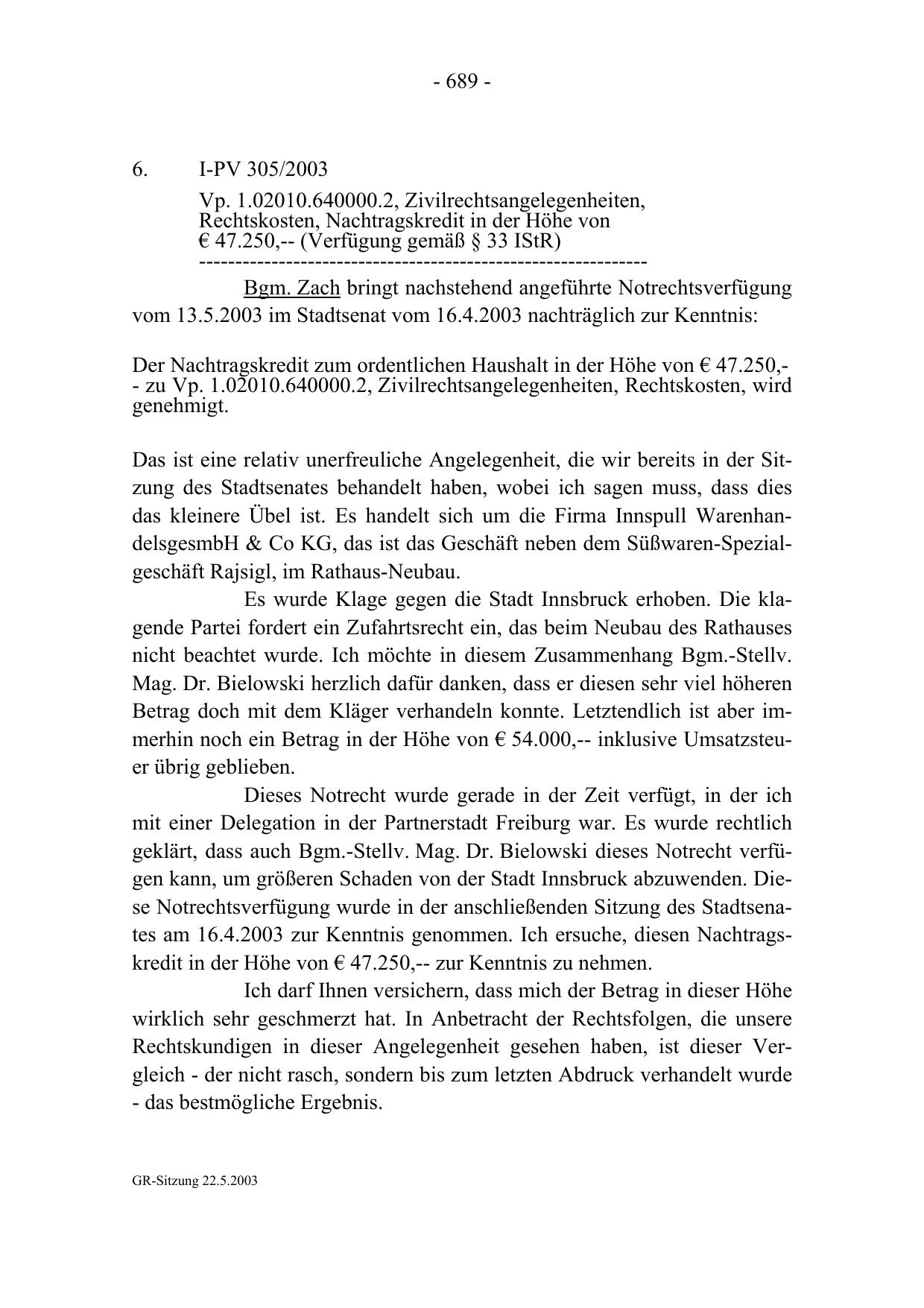geklärt, dass auch Bgm.-Stellv. Mag. Dr. Bielowski dieses Notrecht verfügen kann, um größeren Schaden von der Stadt Innsbruck abzuwenden. Diese Notrechtsverfügung wurde in der anschließenden Sitzung des Stadtsenates am 16.4.2003 zur Kenntnis genommen. Ich ersuche, diesen Nachtragskredit in der Höhe von € 47.250,-- zur Kenntnis zu nehmen.