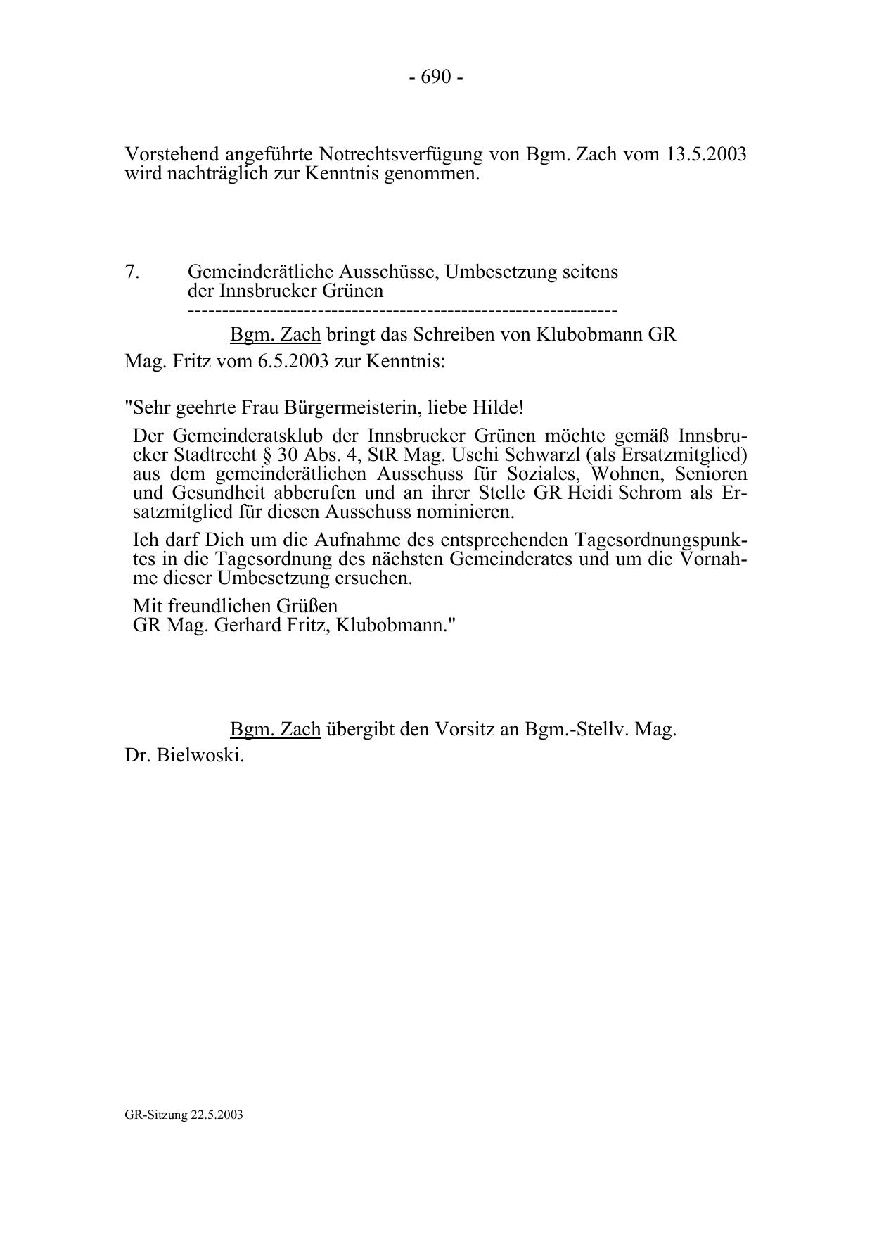 Mag. Fritz vom 6.5.2003 zur Kenntnis: