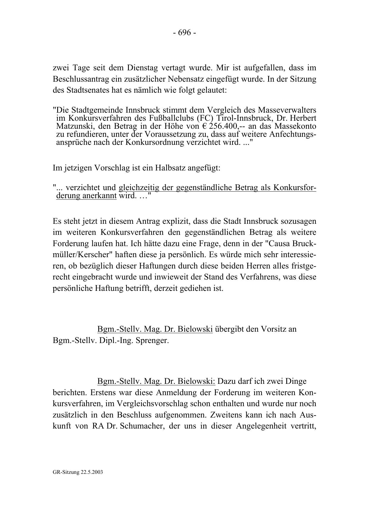 im Konkursverfahren des Fußballclubs (FC) Tirol-Innsbruck, Dr. Herbert