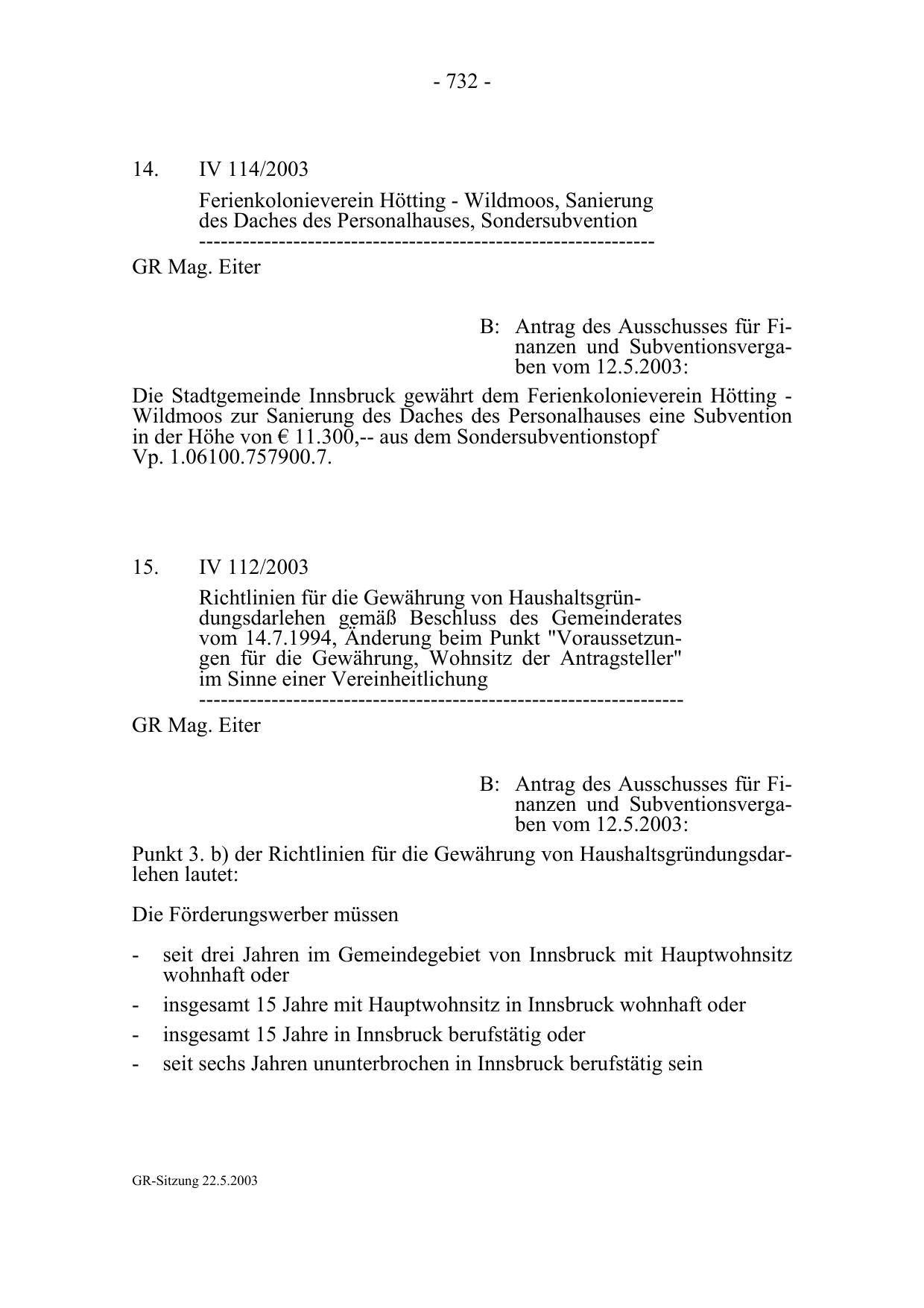 B: Antrag des Ausschusses für Finanzen und Subventionsvergaben vom 12.5.2003: