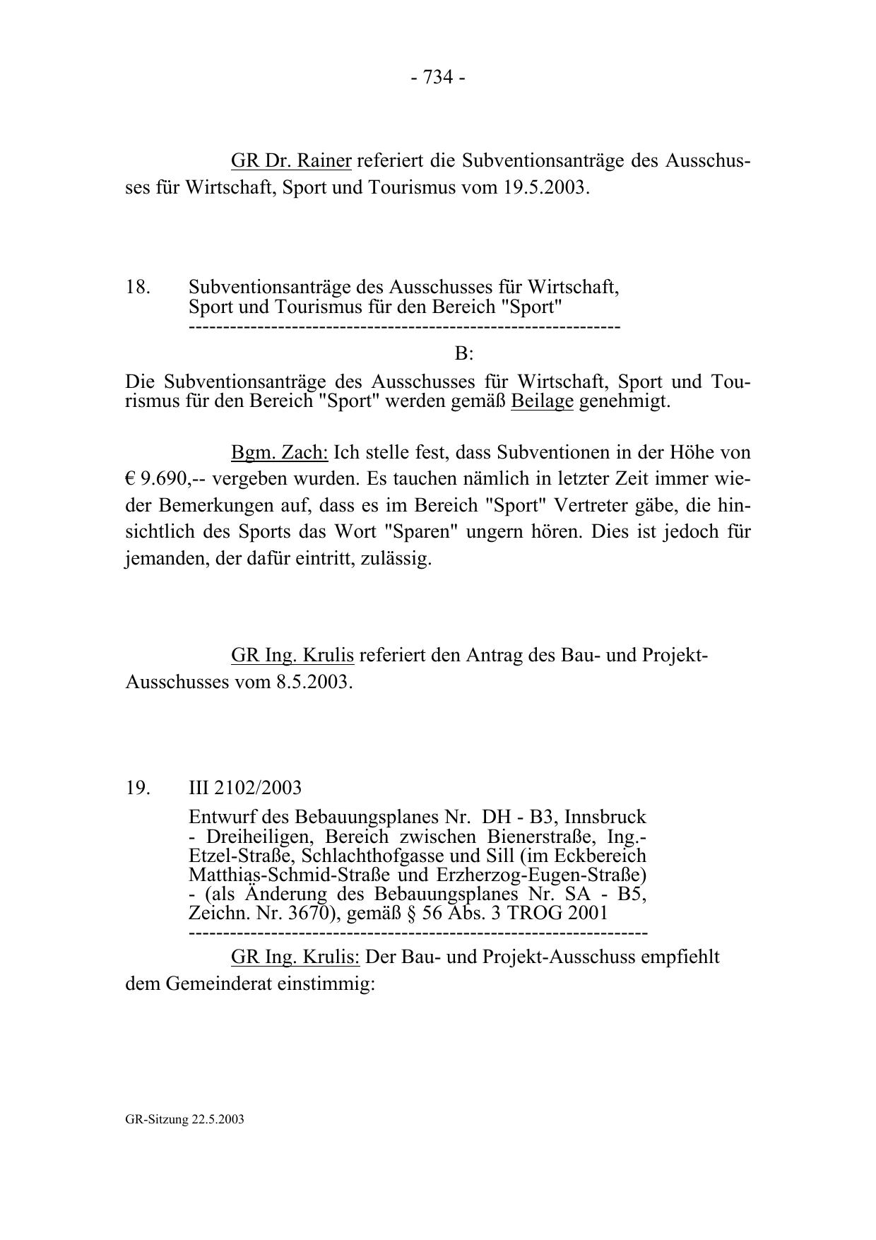 GR Dr. Rainer referiert die Subventionsanträge des Ausschusses für Wirtschaft, Sport und Tourismus vom 19.5.2003.