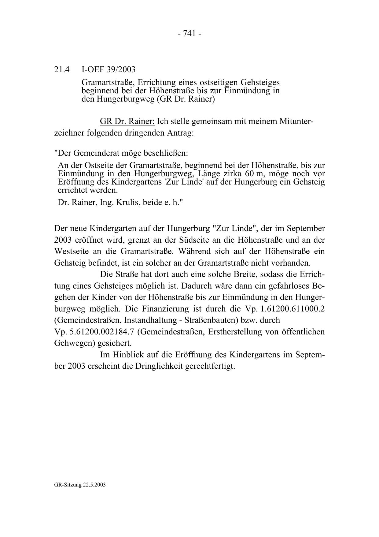 Die Straße hat dort auch eine solche Breite, sodass die Errichtung eines Gehsteiges möglich ist. Dadurch wäre dann ein gefahrloses Begehen der Kinder von der Höhenstraße bis zur Einmündung in den Hungerburgweg möglich. Die Finanzierung ist durch die Vp. 1.61200.611000.2
